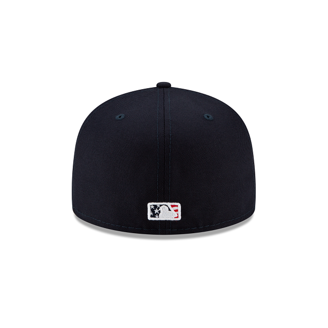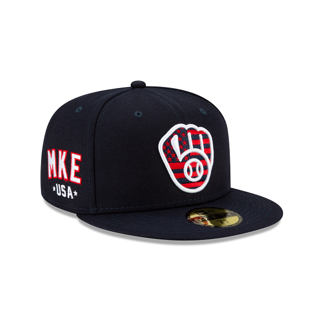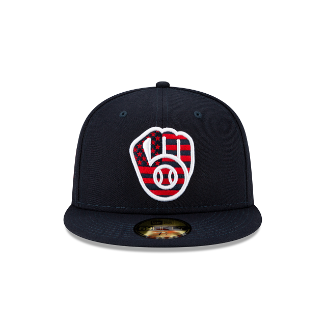 Show your patriotism with the Milwaukee Brewers Independence Day 59FIFTY Fitted Cap featuring an intricate stars and stripes pattern embroidered within the Brewers logo at the front panels with a city-specific logo embroidered at the right wear side and a matching MLB Batterman logo at the rear.