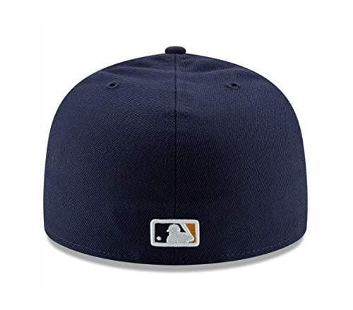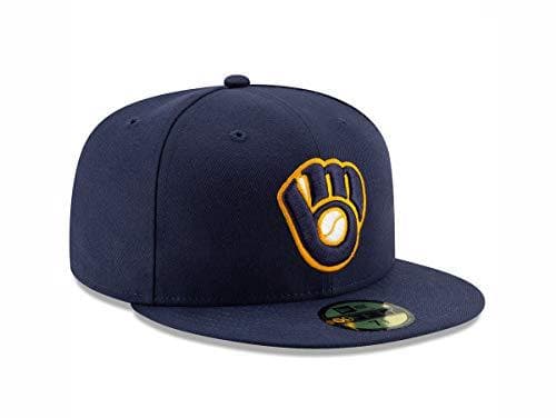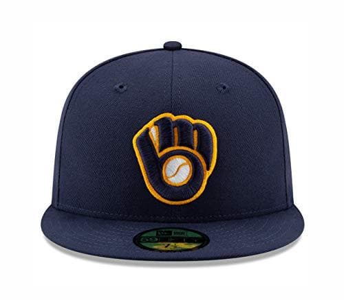 The Milwaukee Brewers fitted hat has a solid rich navy blue and golden yellow color scheme. The fitted hat is straight forward the Milwaukee Brewers logo on the front of the cap and the official MLB batterman logo on the back. The New Era flag is n golden yellow embroidery located on the left side of the hat.