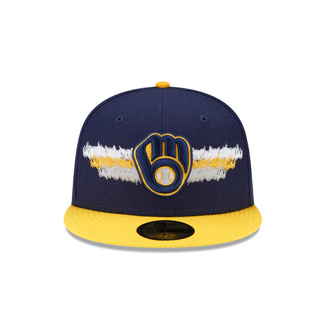 Practice your shading with the Milwaukee Brewers Scribble 59FIFTY Fitted Cap featuring an embroidered team color layered scribble detailing, complimented by the teams logo embroidered at the front panels with a matching MLB Batterman logo at the rear and a gray undervisor.