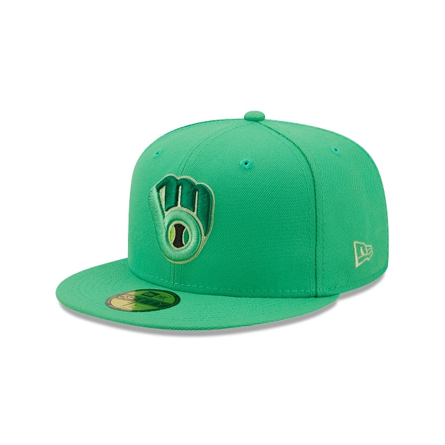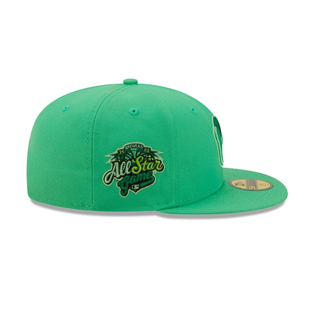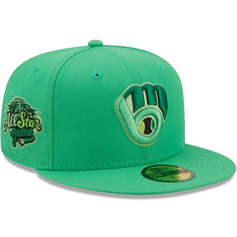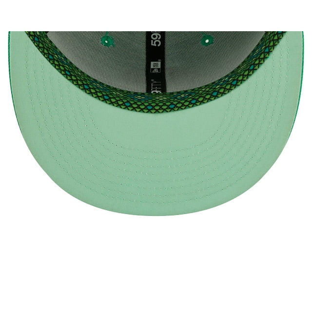 The Milwaukee Brewers Snakeskin 59FIFTY Fitted Cap features an embroidered Brewers multi-colored logo at the front panels, a 2002 All-Star Game patch at the right-wear side, and a matching MLB Batterman logo at the rear. Additional details include a snakeskin inspired inner sweatband and green undervisor.