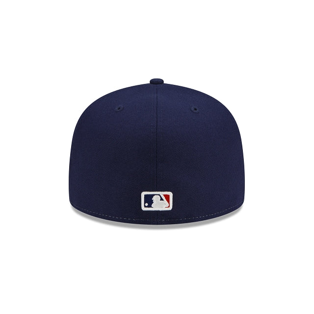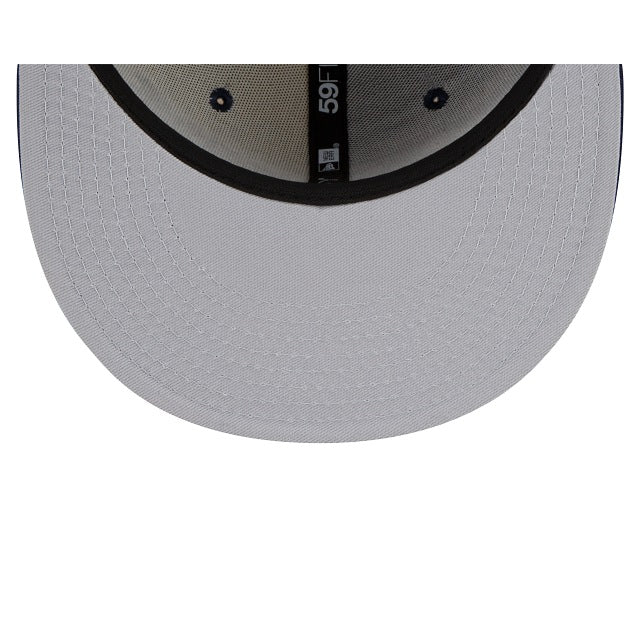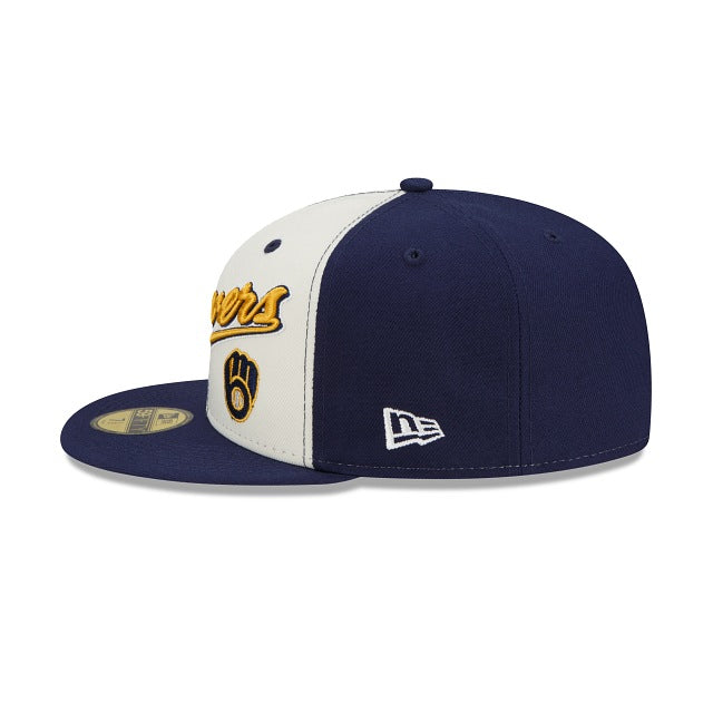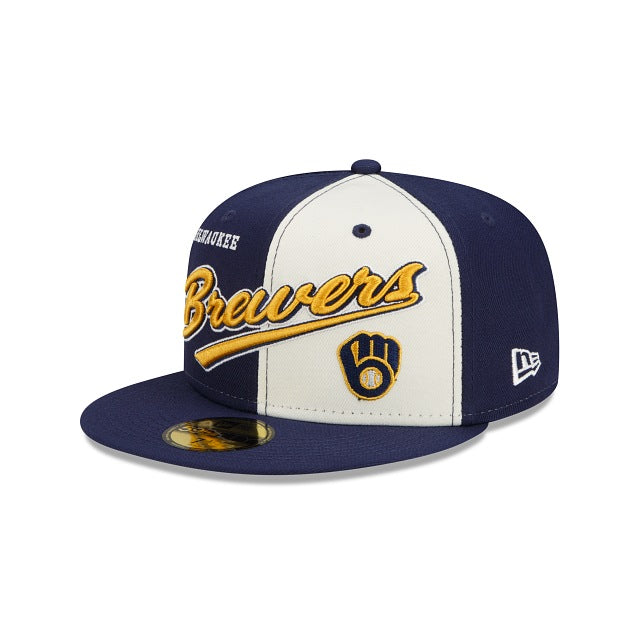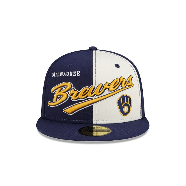 The Milwaukee Brewers Split Front 59FIFTY Fitted Cap features a two-tone fabrication with an embroidered Brewers script at the front panels with a league specific patch at the right-wear side and the MLB Batterman logo at the rear.