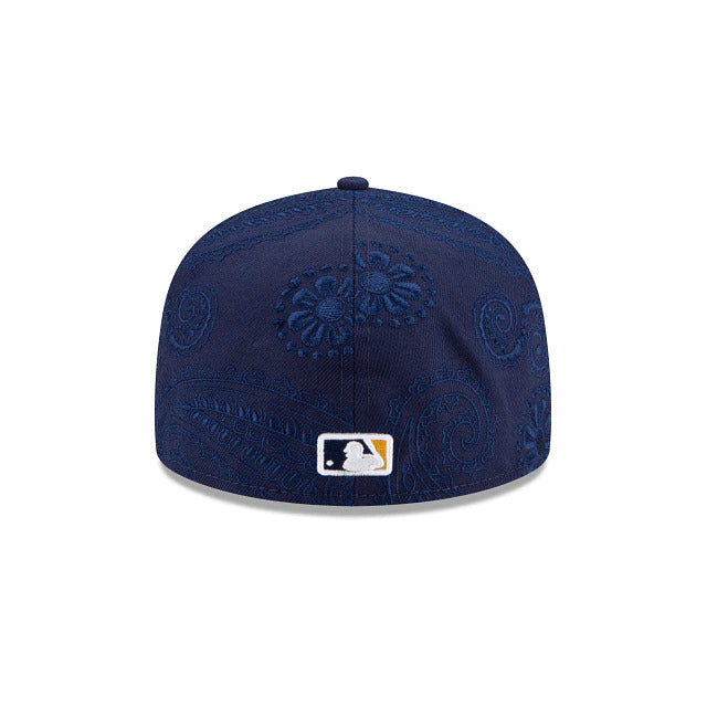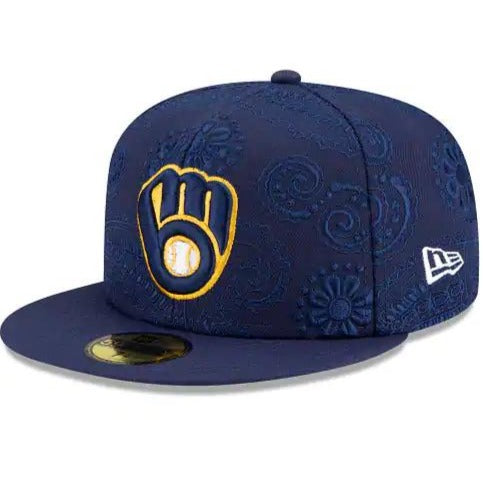 Enter the vortex with the Milwaukee Brewers Swirl 59FIFTY Fitted Cap featuring a tonal paisley embroidery throughout the crown with the teams logo embroidered at the front panels with a MLB Batterman logo at the rear and a gray undervisor.