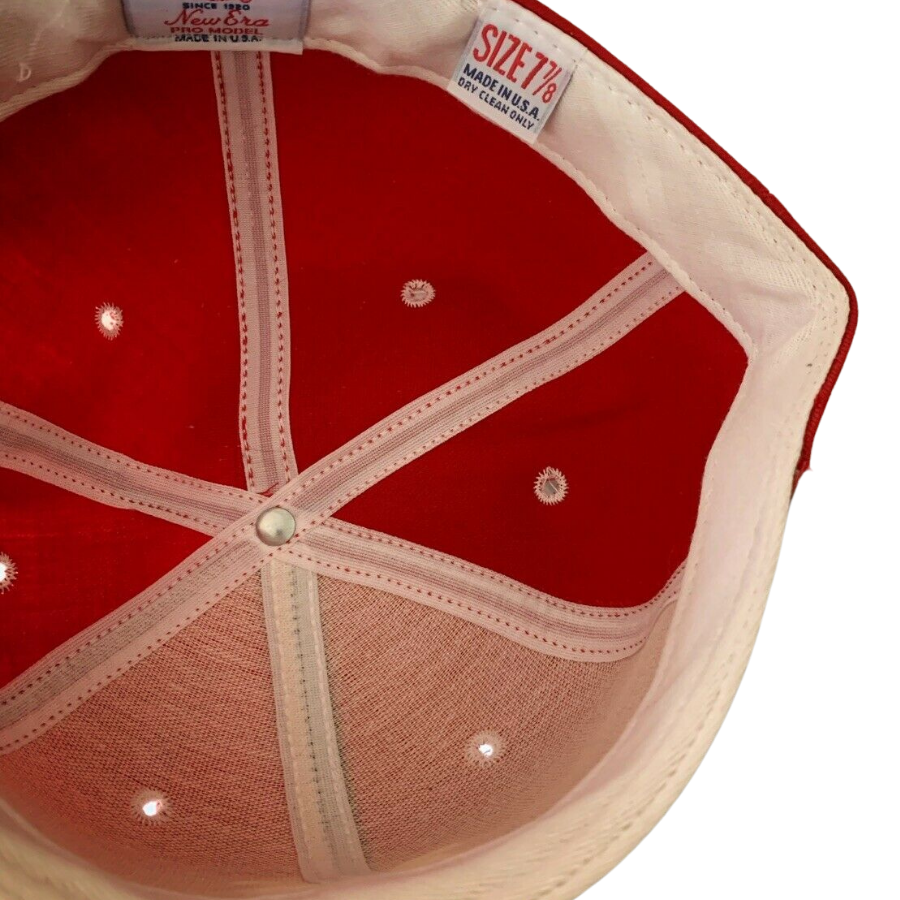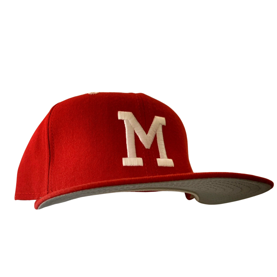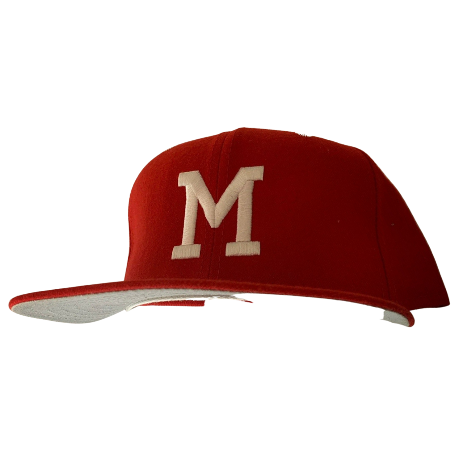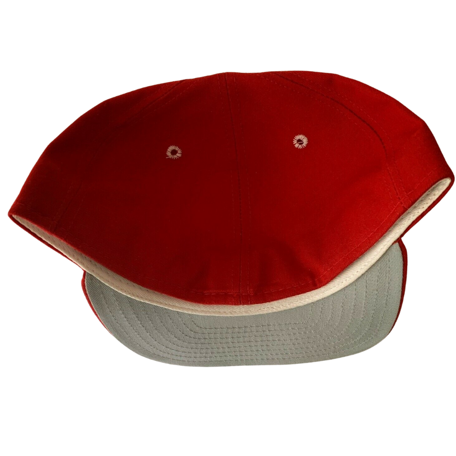 This New Era Milwaukee Brewers vintage fitted hat has a red and white colorway. The six panel structured high crown, embroidered eyelets and fabric squatchee button are red. The flat bill of the fitted cap is also red with a grey bottom undervisor and white sweatband. The front panel features the Milwaukee Brewers 70's logo embroidered in white thread. No MLB Batterman logo embroidered on the back nor are there any visible side patches.