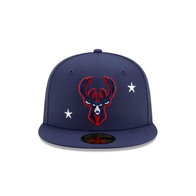 The Milwaukee Bucks Americana 59FIFTY Fitted Cap features an embroidered Milwaukee Bucks logo at the front panels with star embroideries throughout the crown. Additional details include a NBA Champions patch at the right-wear side, the NBA logo at the rear and a gray undervisor.
