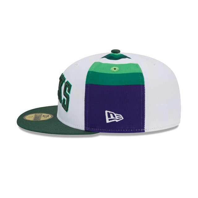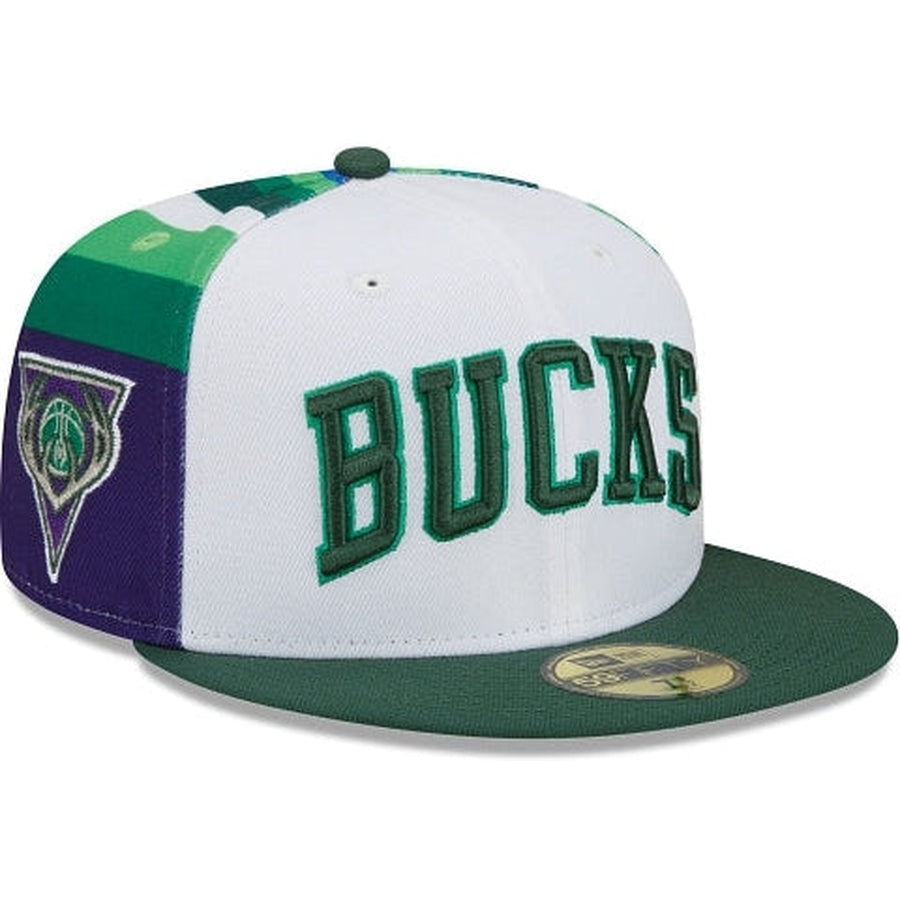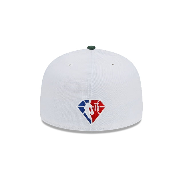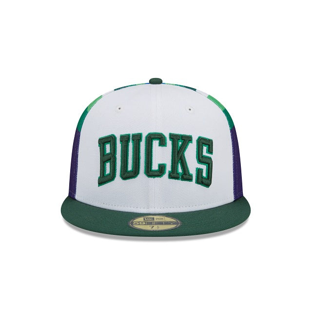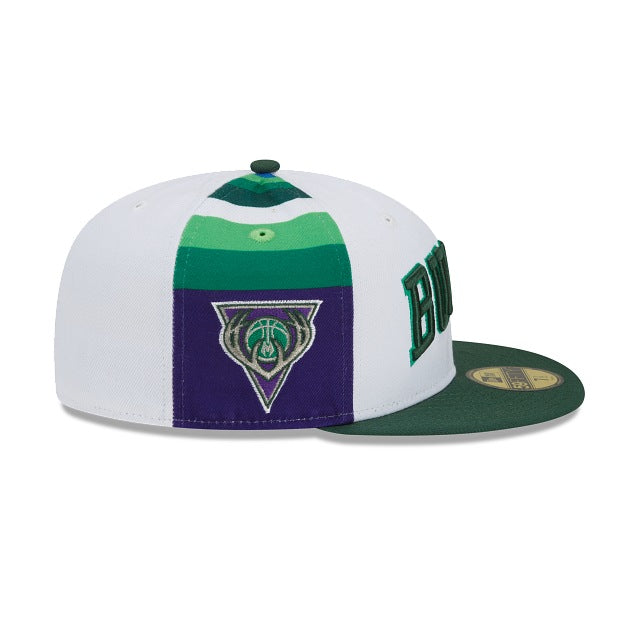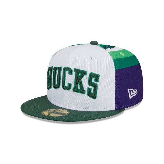 There's no limit in this city. The Milwaukee Bucks City Edition 59FIFTY Fitted Cap features an embroidered Bucks wordmark at the front panels, a team logo at the right-wear side, and the Official NBA 75th Anniversary logo at the rear. Additional details include a uniquely curated city inspired crown.