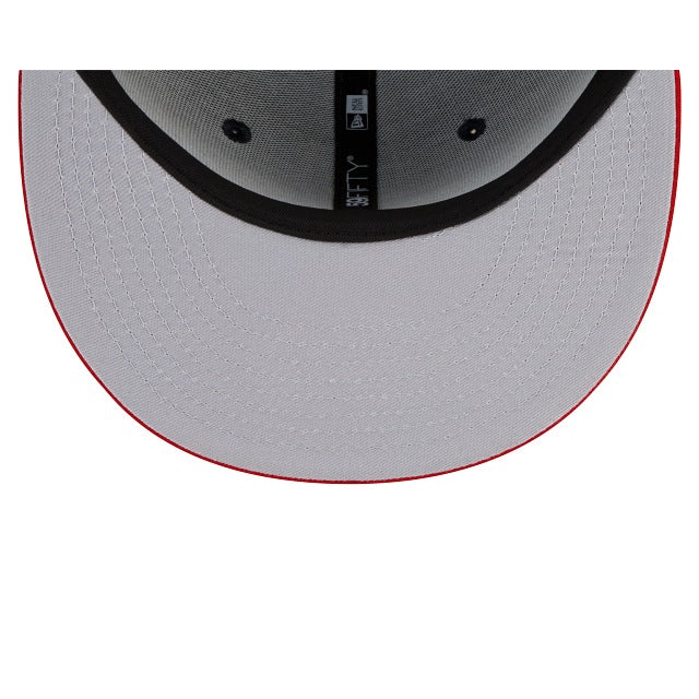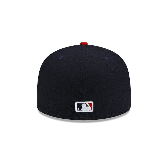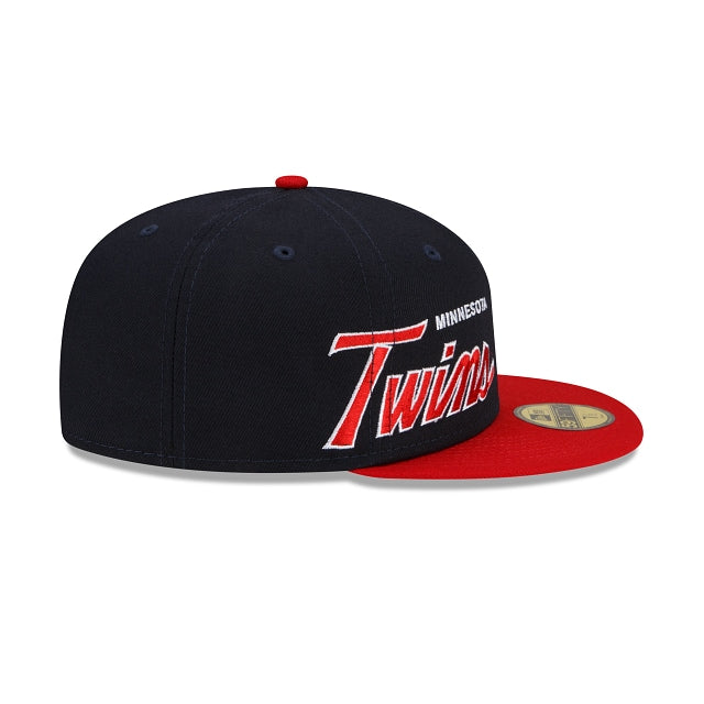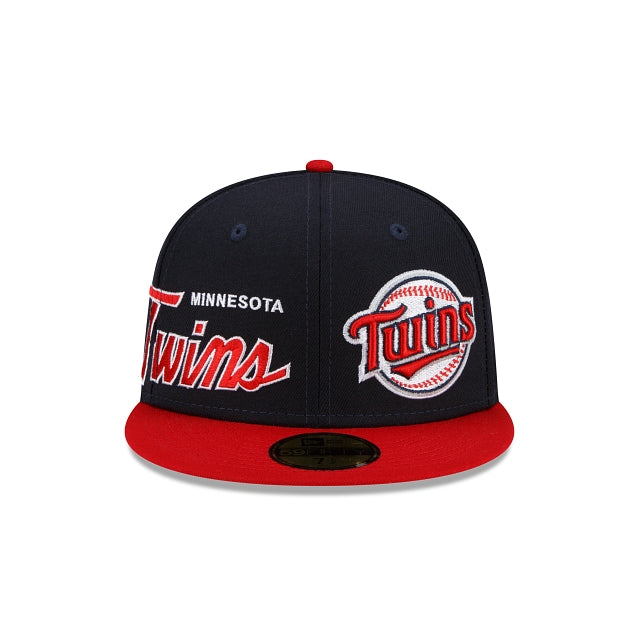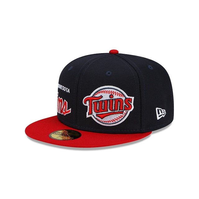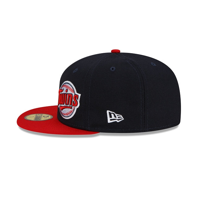 The Minnesota Twins Double Logo 59FIFTY Fitted Cap features a two tone team fabrication with an embroidered Twins logo at the front left-wear panel, complimented by a team script at the right-wear side and a matching MLB Batterman logo at the rear.