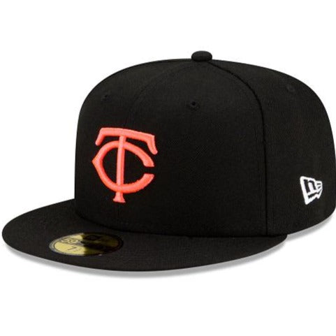 The Minnesota Twins Summer Pop 59FIFTY Fitted Cap features a neon Twins logo embroidered at the front panels with a World Series patch at the right-wear side and a matching MLB Batterman logo at the rear. Additional details include a snakeskin print undervisor.