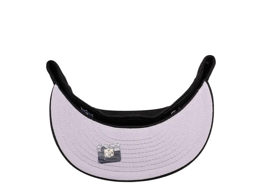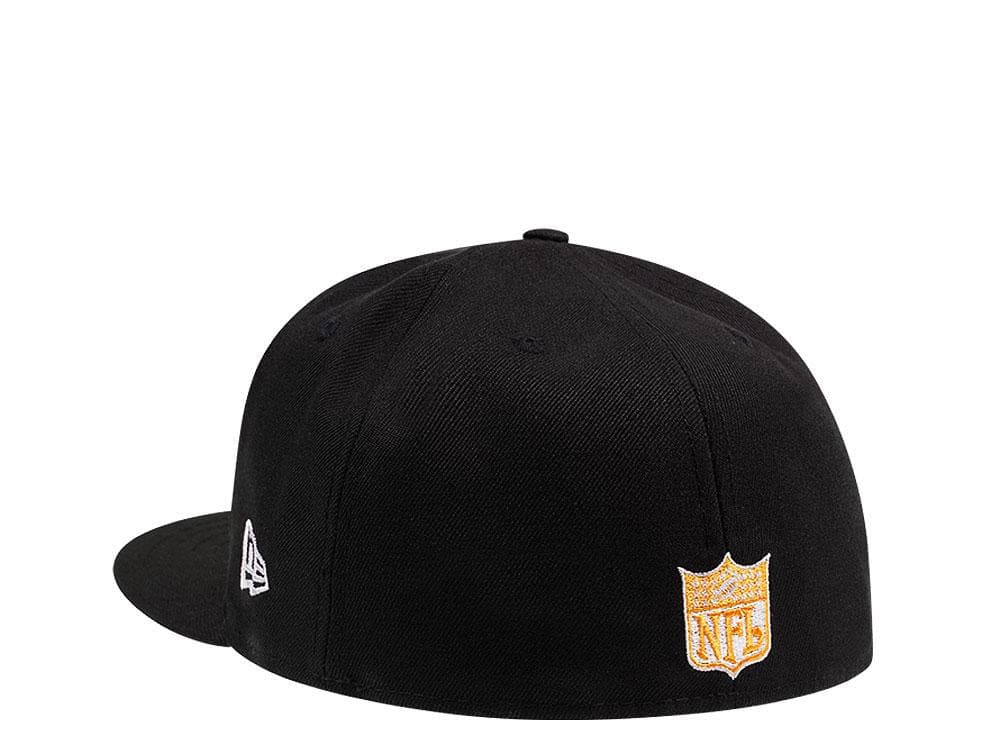 The New Era Minnesota Vikings 59FIFTY fitted hat features a black and white colorway with a yellow accent. The six panel structured high crown, embroidered eyelets and fabric squatchee button are black. The flat bill of the fitted cap is black with a grey bottom undervisor. The front panel features the Minnesota Vikings single horn logomark embroidered in white and yellow threads. The left panel features the New Era "Fly Your Own Flag" logo. The back of the crown features the official NFL shield embroidered in yellow and white colorway.