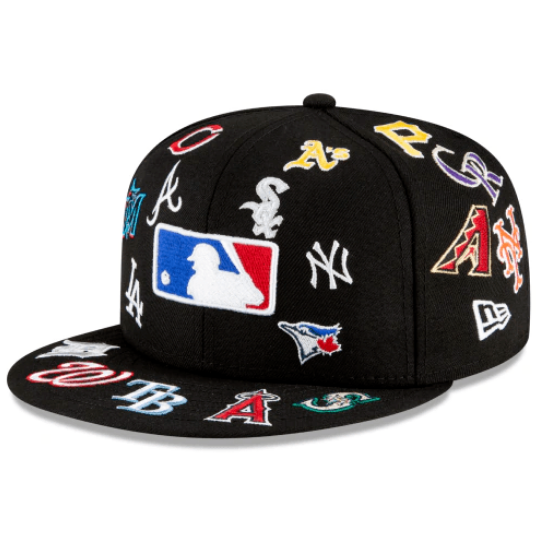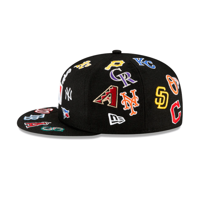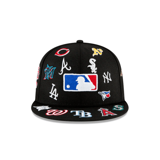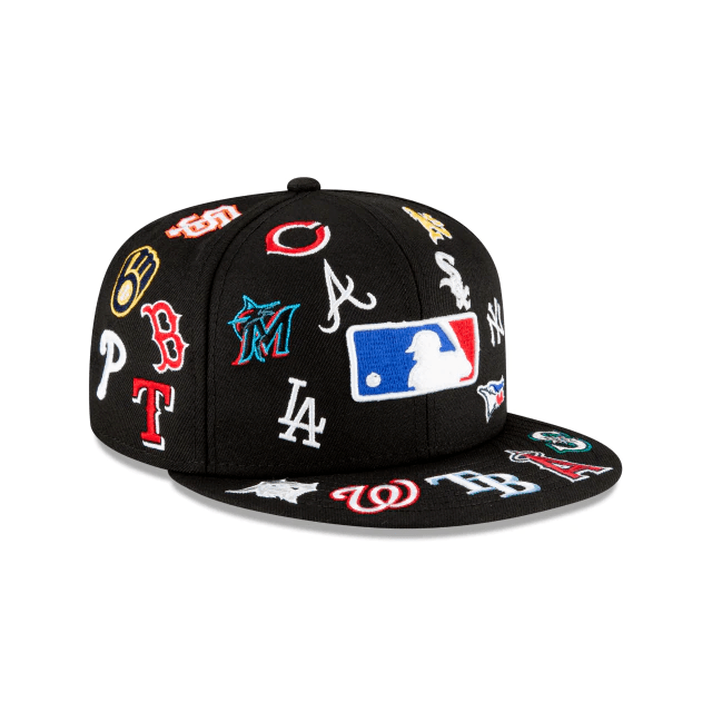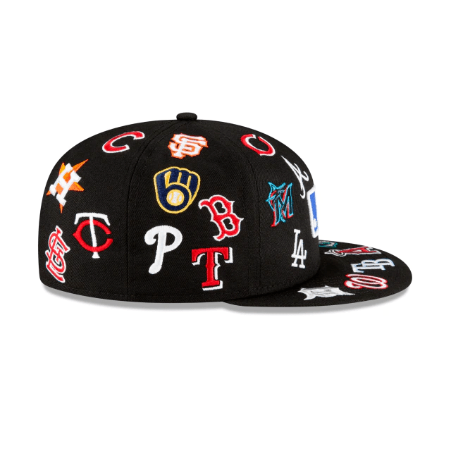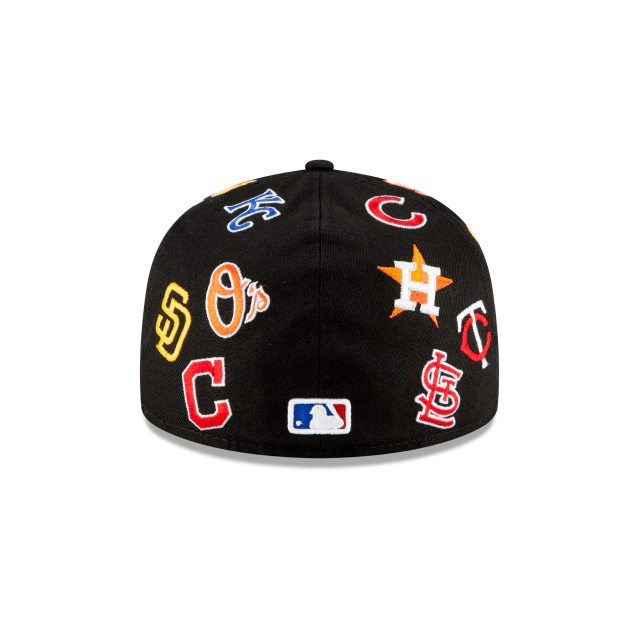 Back from the vault, the MLB All Over 59FIFTY Fitted Cap features the Official MLB Batterman logo embroidered at the front panels with all 30 team logos embroidered throughout the crown and visor with a smaller MLB Batterman logo at the rear. Additional details include a gray undervisor, custom sweatband and interior taping with gold accents in celebration of our 100th Anniversary.