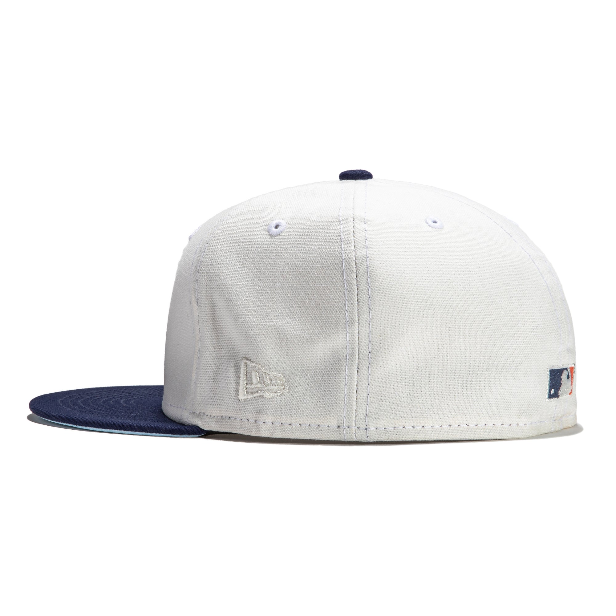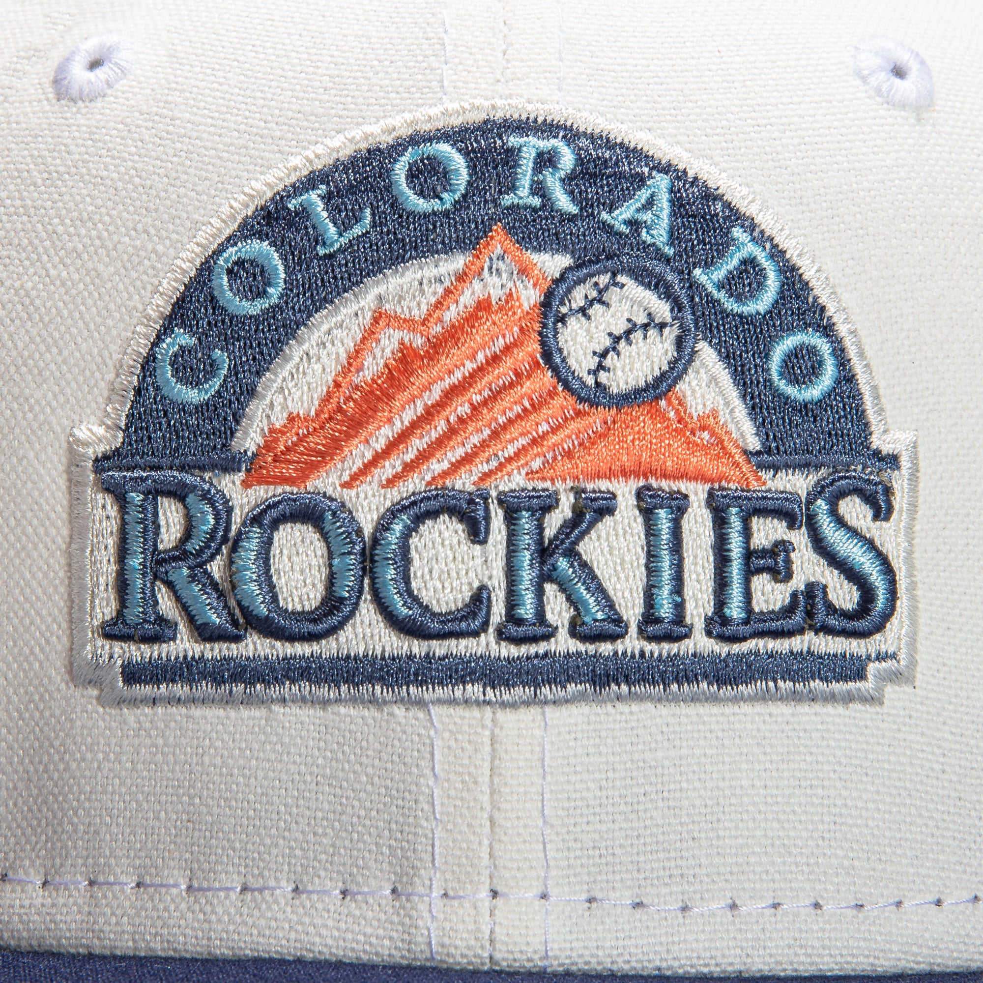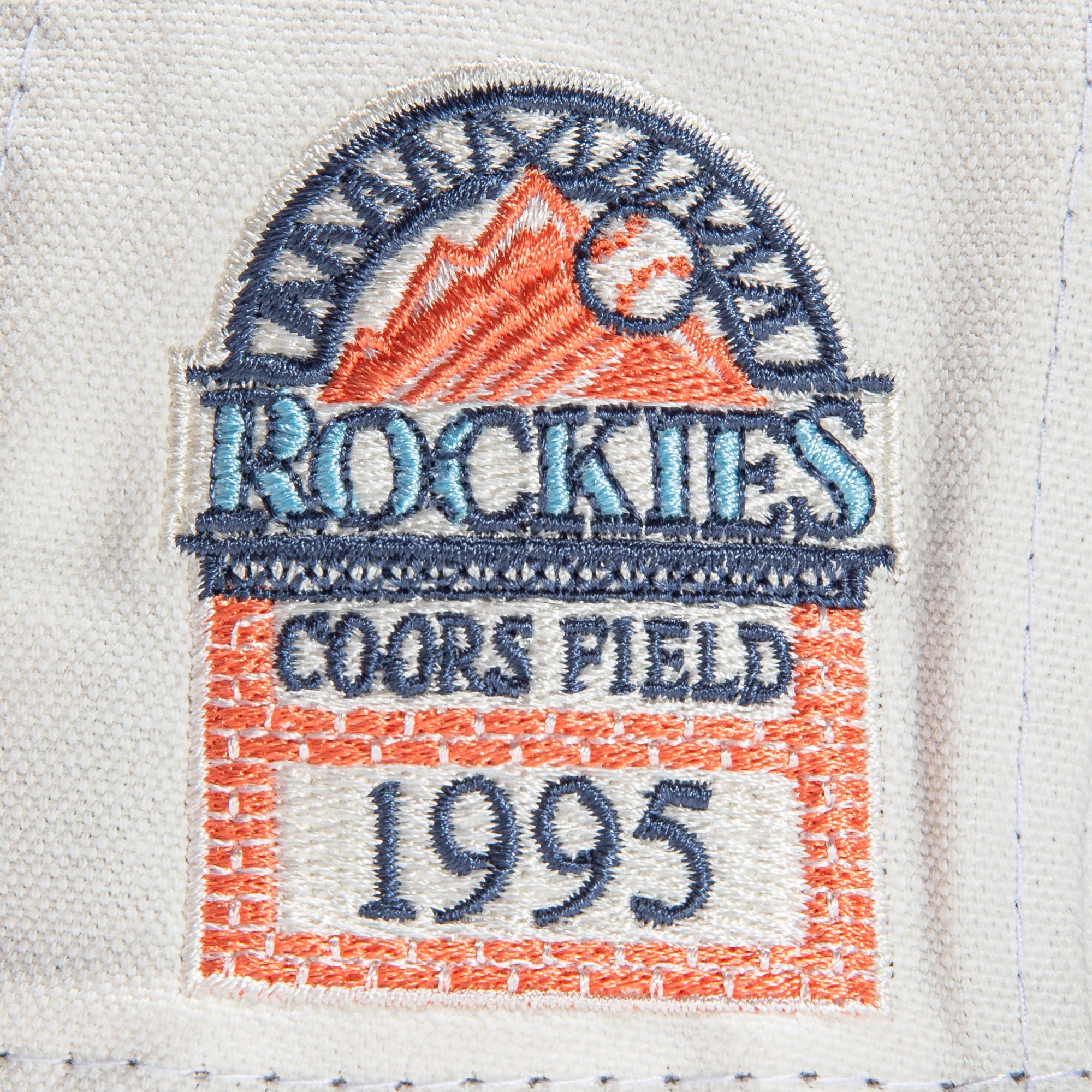 This New Era Monaco Colorado Rockies 1995 Inaugural 59FIFTY Fitted Hat is a Hat Club exclusive. The fitted has a stone six panel structured high crown and embroidered eyelets with a navy fabric squatchee button. The fitted cap also has a navy flat bill with a light blue satin undervisor. The front panel features the Colorado Rockies logo embroidery and a 1995 Inaugural Season side patch embroidery on the right panel. The left panel of the fitted displays the New Era logo and the official MLB logo embroidery on the rear crown.