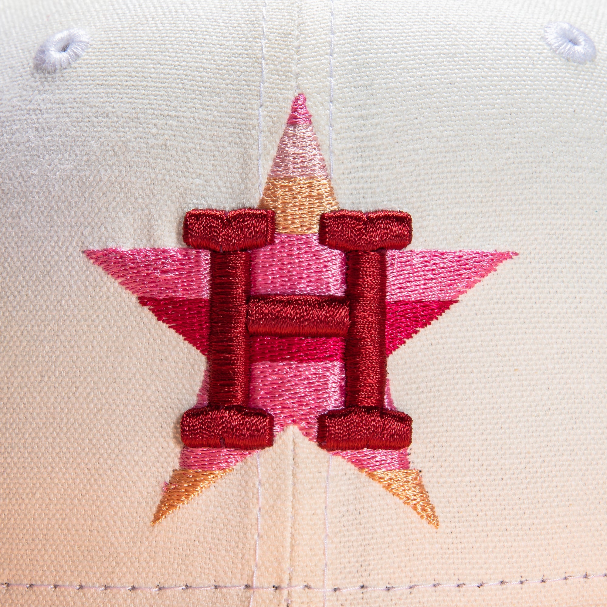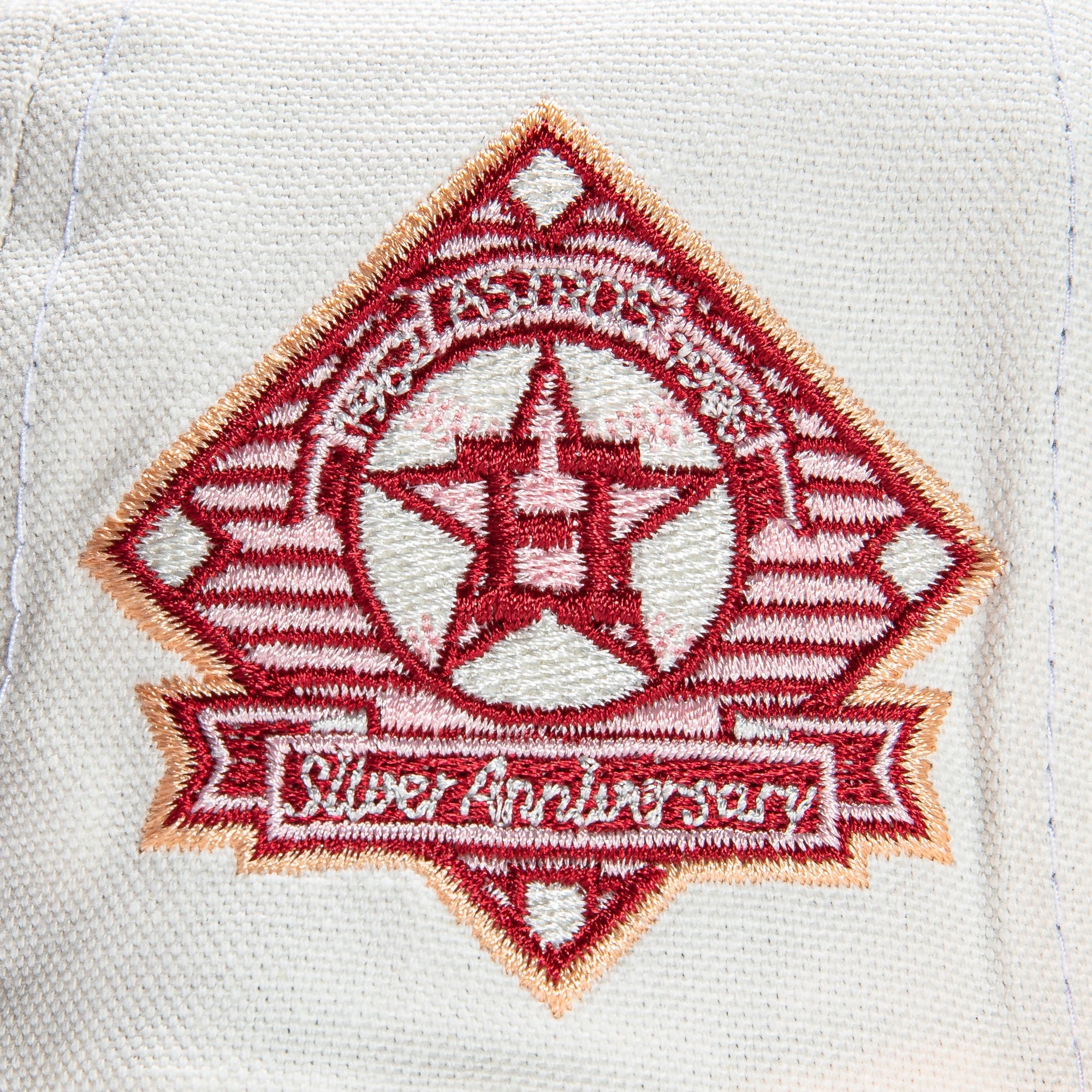 This New Era Monaco Houston Astros 25th Anniversary 59FIFTY Fitted Hat is a Hat Club exclusive. The fitted has a stone six panel structured high crown and embroidered eyelets with a peach fabric squatchee button. The fitted cap also has a peach flat bill with a maroon satin undervisor. The front panel features the Houston Astros logo embroidery and a 25th Anniversary side patch embroidery on the right panel. The left panel of the fitted displays the New Era logo and the official MLB logo embroidery on the rear crown.