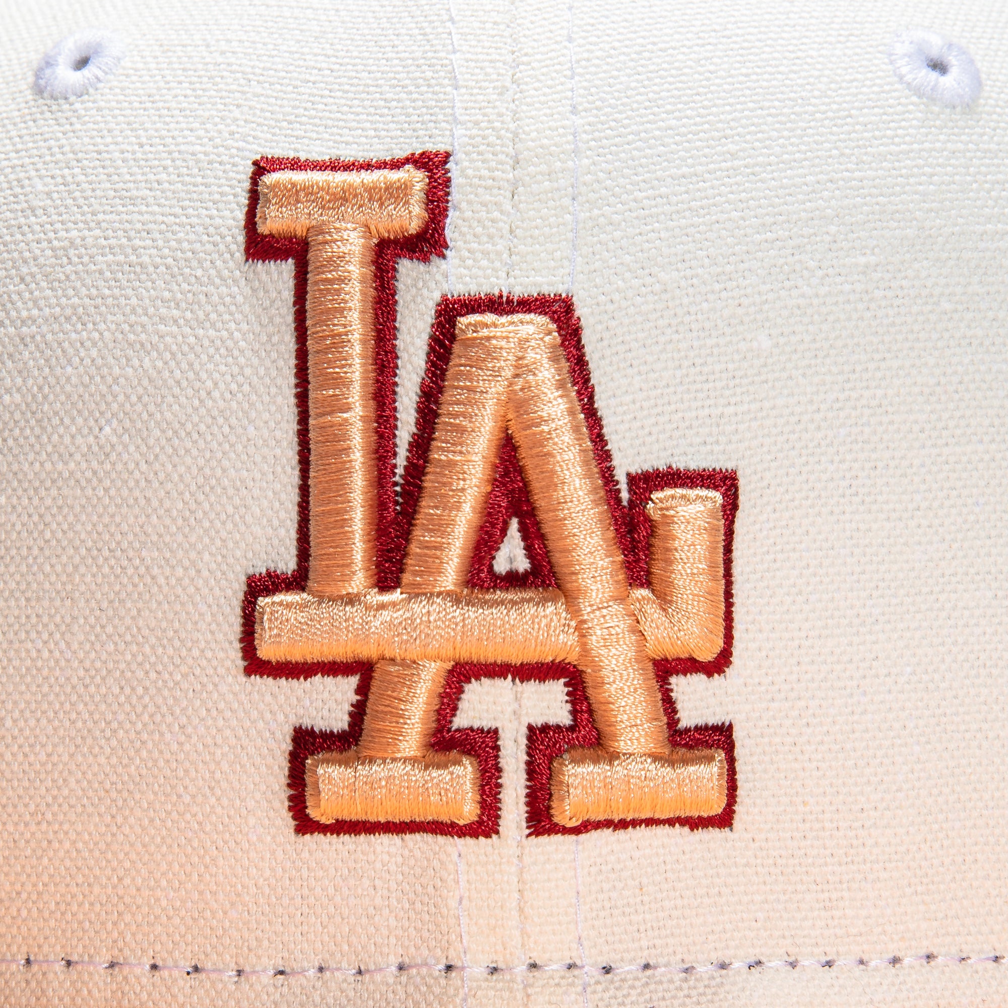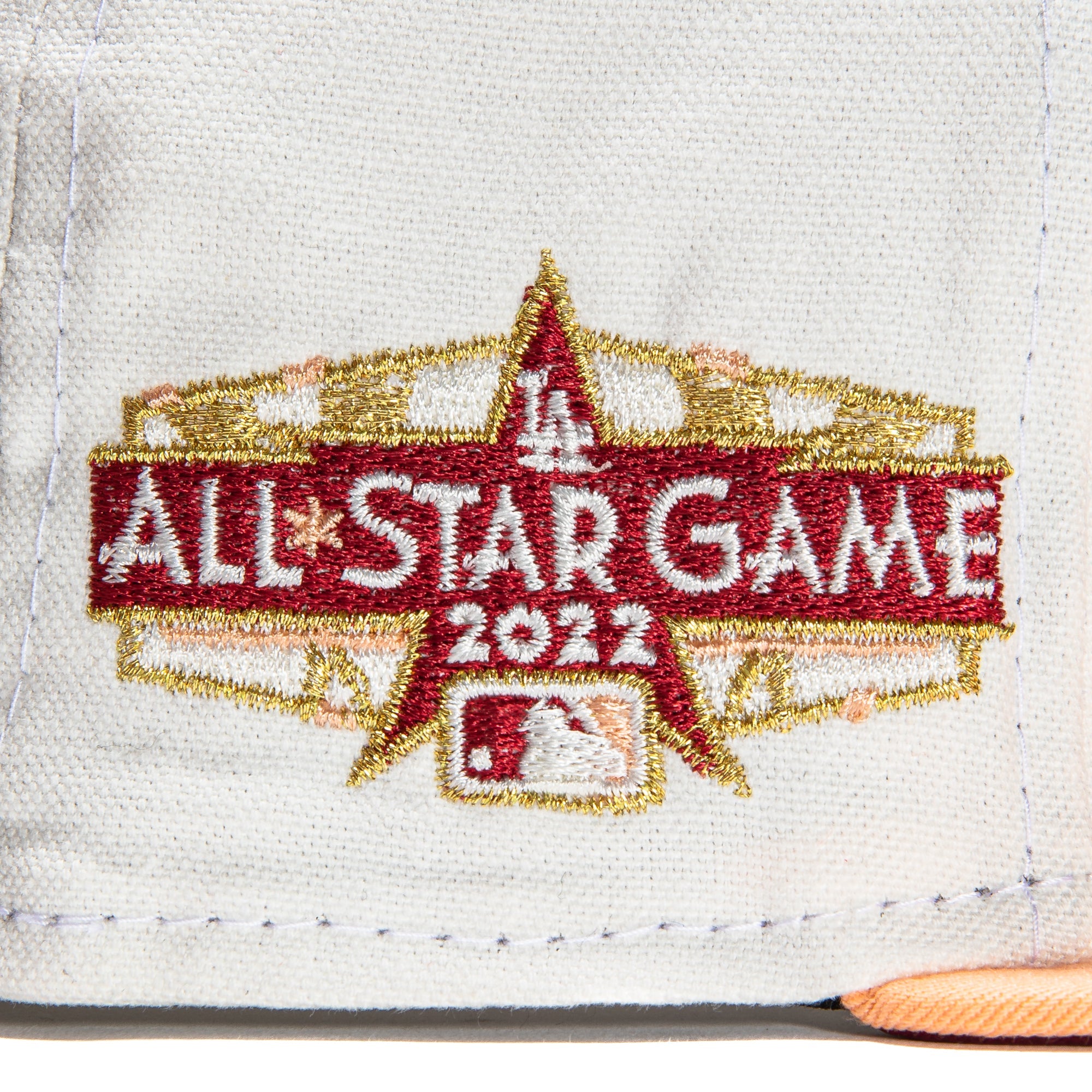 This New Era Monaco Los Angeles Dodgers 2022 All-Star Game 59FIFTY Fitted Hat is a Hat Club exclusive. The fitted has a stone six panel structured high crown and embroidered eyelets with a peach fabric squatchee button. The fitted cap also has a peach flat bill with a maroon satin undervisor. The front panel features the Los Angeles Dodgers logo embroidery and a 2022 ASG side patch embroidery on the right panel. The left panel of the fitted displays the New Era logo and the official MLB logo embroidery on the rear crown.