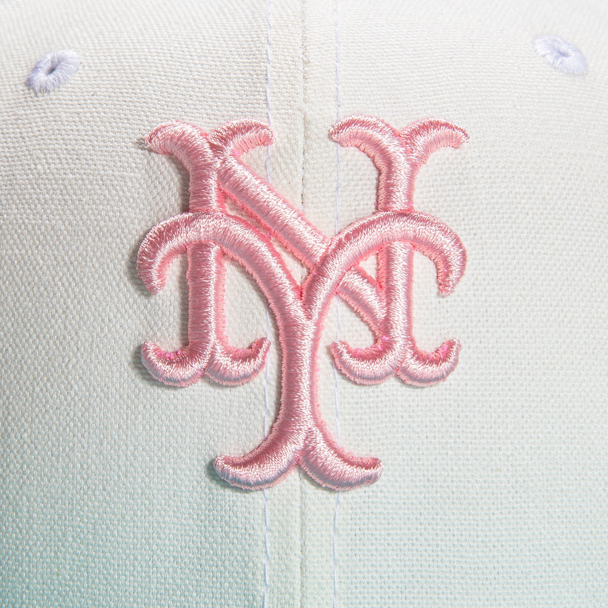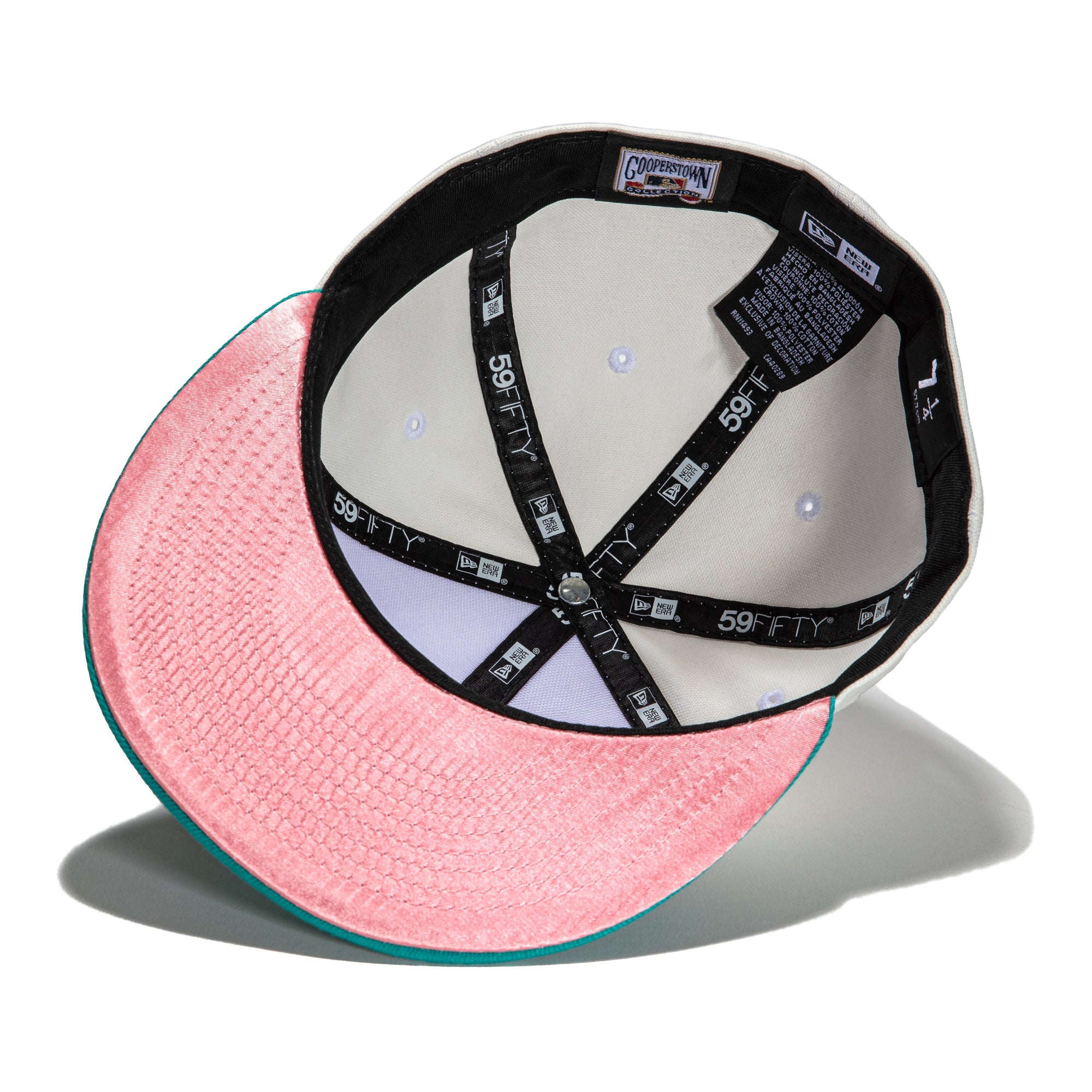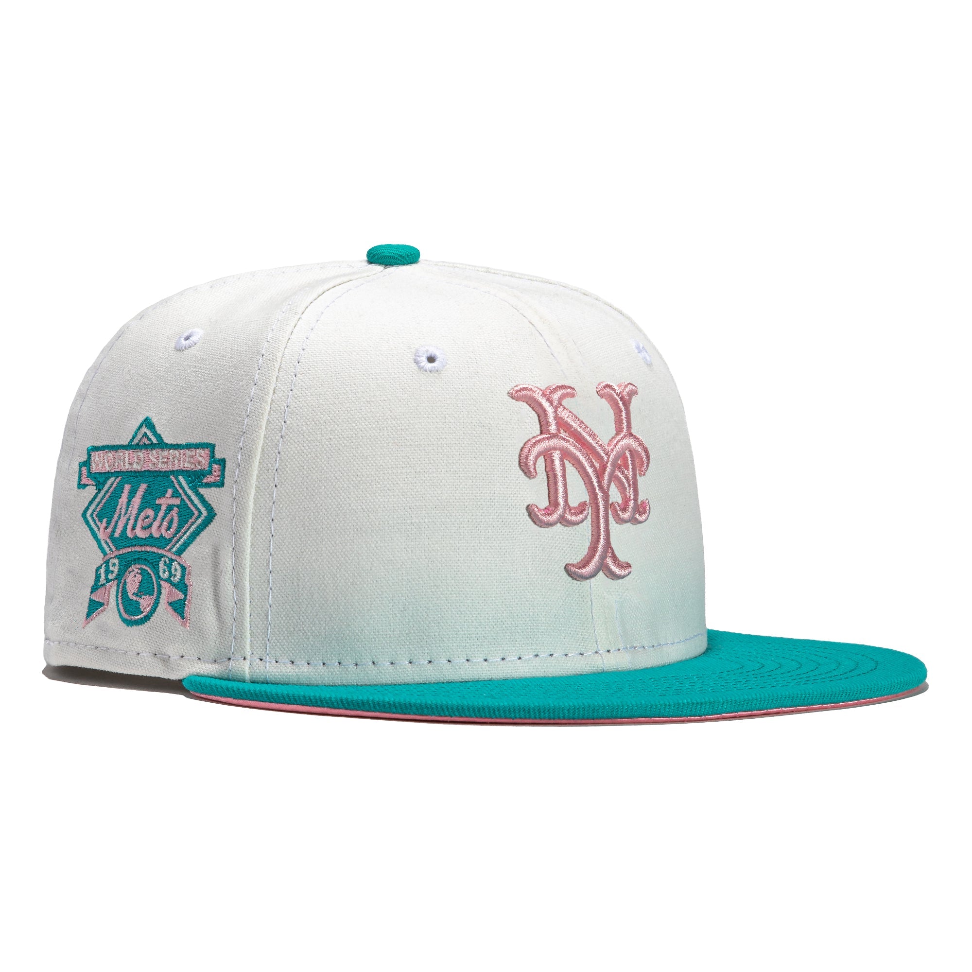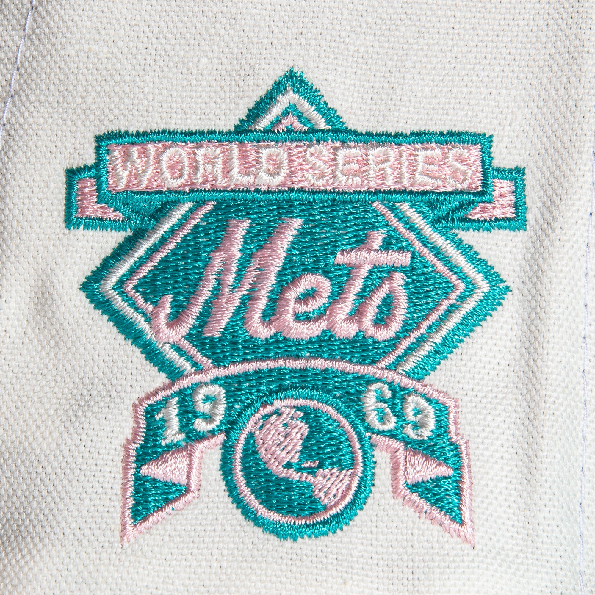 This New Era Monaco New York Mets 1969 World Series 59FIFTY Fitted Hat is a Hat Club exclusive. The fitted has a stone six panel structured high crown and embroidered eyelets with a navy fabric squatchee button. The fitted cap also has a navy flat bill with a pink satin undervisor. The front panel features the New York Mets logo embroidery and a 1969 World Series side patch embroidery on the right panel. The left panel of the fitted displays the New Era logo and the official MLB logo embroidery on the rear crown.