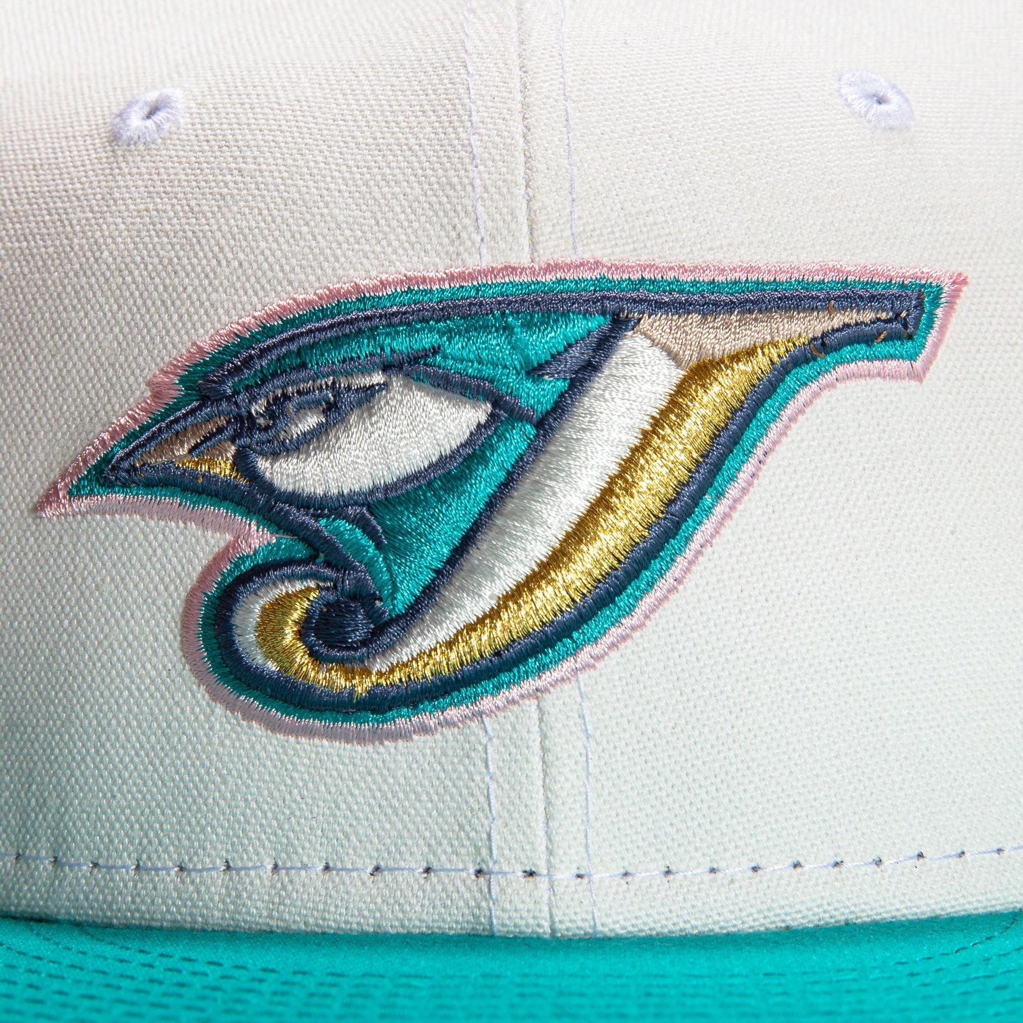 This New Era Monaco Toronto Blue Jays 30th Anniversary 59FIFTY Fitted Hat is a Hat Club exclusive. The fitted has a stone six panel structured high crown and embroidered eyelets with a teal fabric squatchee button. The fitted cap also has a teal flat bill with a pink satin undervisor. The front panel features the Toronto Blue Jays logo embroidery and a 30th Anniversary side patch embroidery on the right panel. The left panel of the fitted displays the New Era logo and the official MLB logo embroidery on the rear crown.