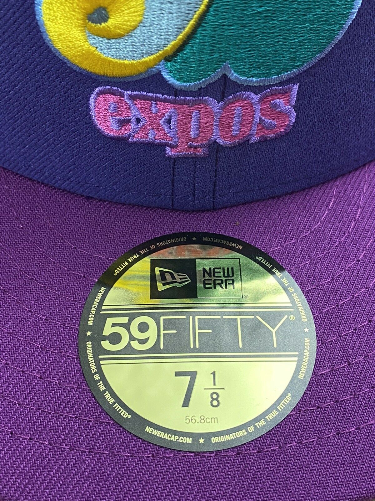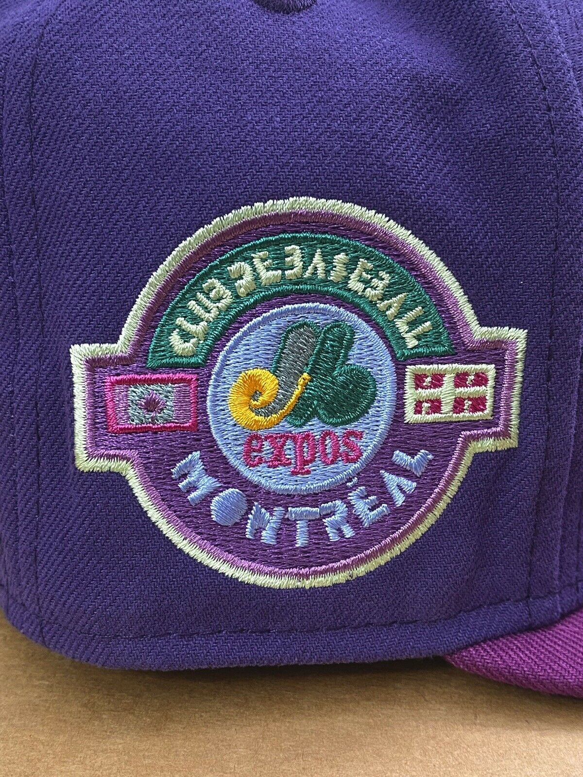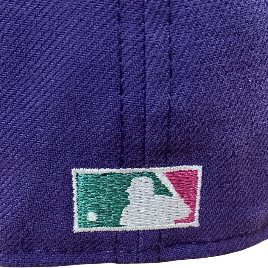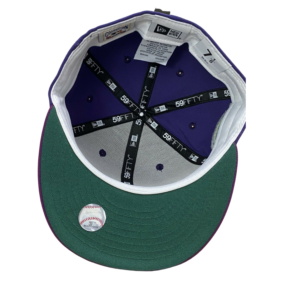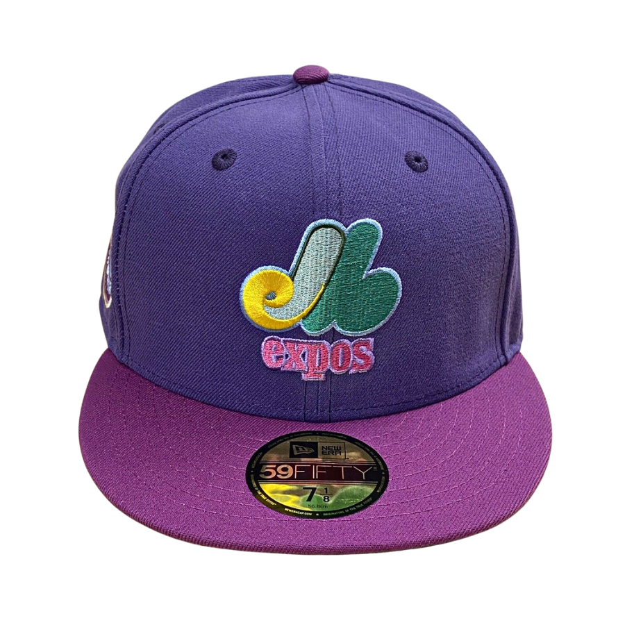 This New Era Montreal Expos "Roald Dahl The Witches" inspired fitted hat is a My Fitteds exclusive. The 59FIFTY fitted cap features purple six panel structured high crown, and embroidered eyelets with a lighter purple fabric squatchee button and flat bill. The undervisor of the fitted is a pine green color with a white sweatband. The front panel features the Montreal Expos logo embroidery and a side patch embroidered on the right panel. The fitted hat colorway was inspired by Roald Dahl children book The Witches.