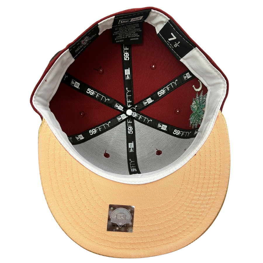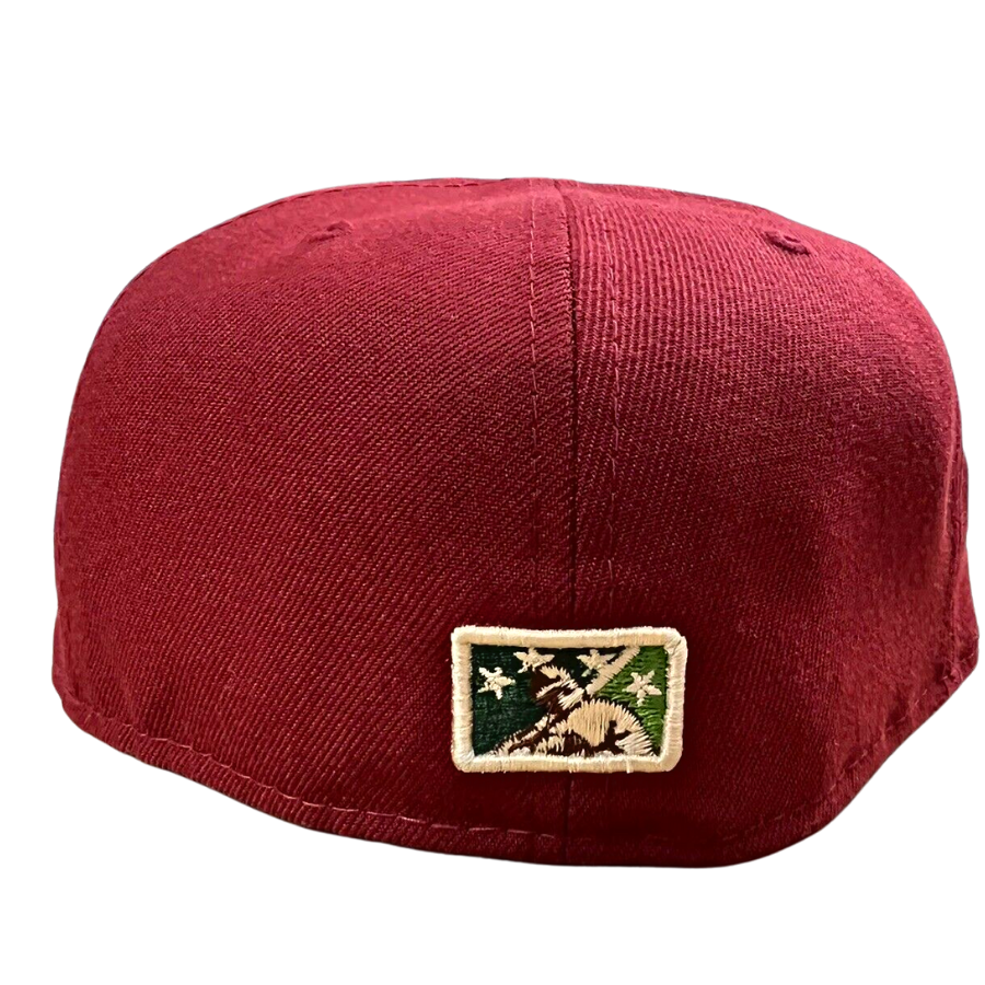 This New Era Myrtle Beach Pelicans 'Harry Potter and the Sorcerer's Stone' inspired 59FIFTY fitted hat is a My Fitteds exclusive release. The fitted cap has a Tudor Red six panel structured high crown and embroidered eyelets with a dark green fabric squatchee button and peach flat bill. The undervisor of the fitted cap is also peach with a white sweatband. The front panel features the Myrtle Beach Pelicans logo embroidery and a side patch embroidery on the right panel. The fitted hat colorway was inspired by Harry Potter and the Sorcerer's Stone, a childrens book by J.K. Rowling.