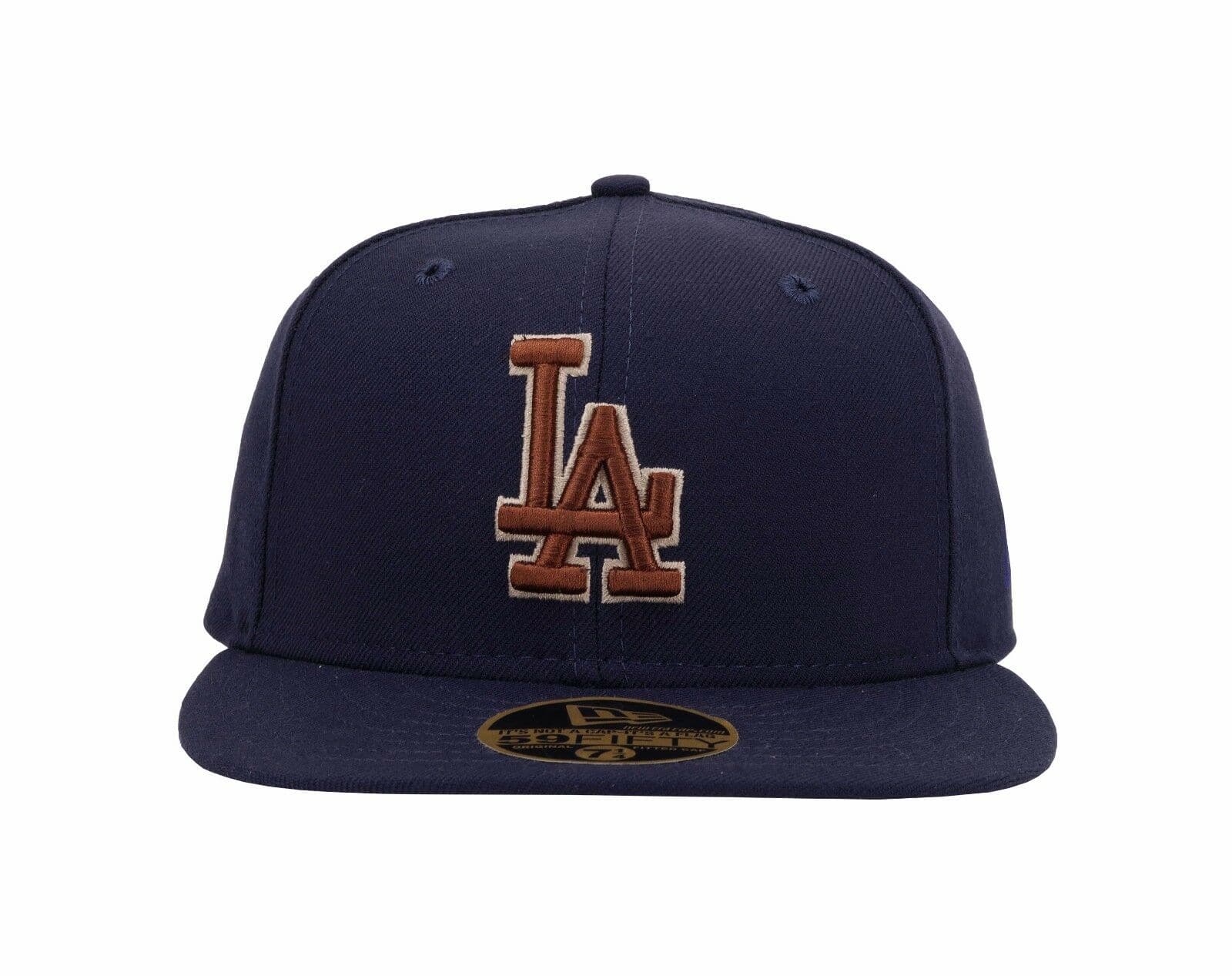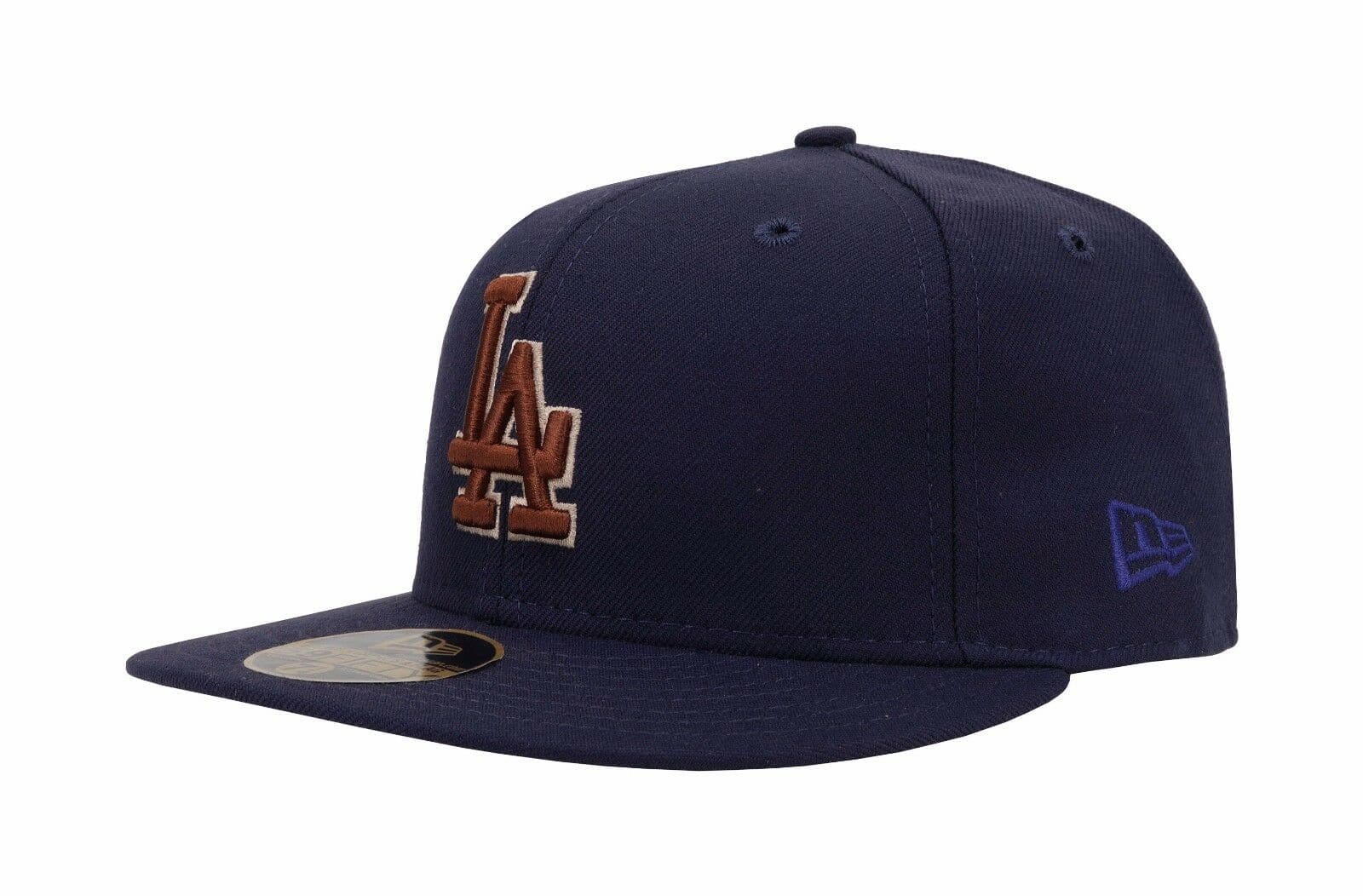 This New Era Los Angeles Dodgers 59Fifty fitted hat has a navy blue and brown colorway. The structured 6 panel high crown, fabric squatchee button and embroidered eyelet are navy blue in color with a grey bottom undervisor. The front "LA" Dodgers logo is embroidered in brown thread. The official MLB batterman logo on the back of the fitted is embroidered in royal blue, brown and white threads.