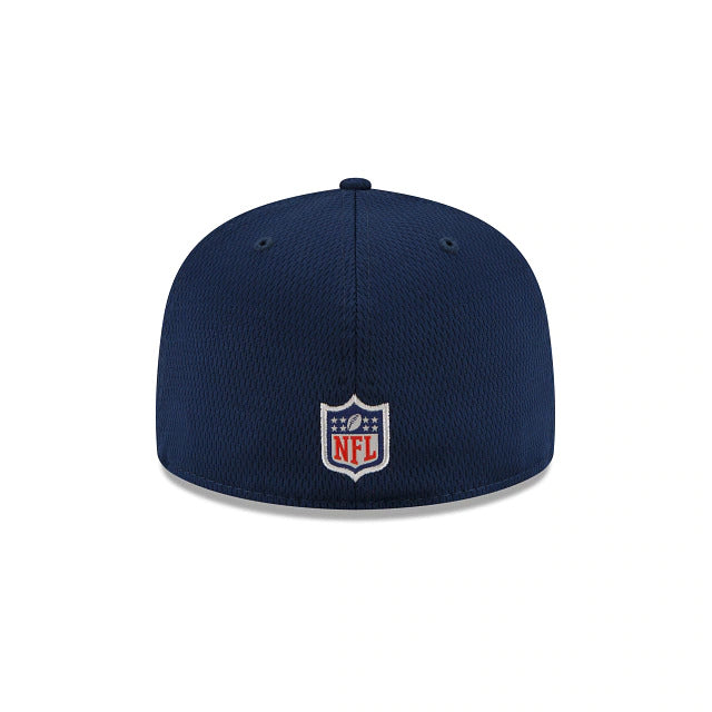 Travel in style with the New England Patriots Official NFL Sideline Road 59FIFTY Fitted Cap featuring a unique two-tone dashmark fabrication with an embroidered team logo at the front panels. Team color accents and the Official NFL Shield at the rear complete the official cap that players, coaches and staff will wear on the sidelines during the 2021 NFL season.