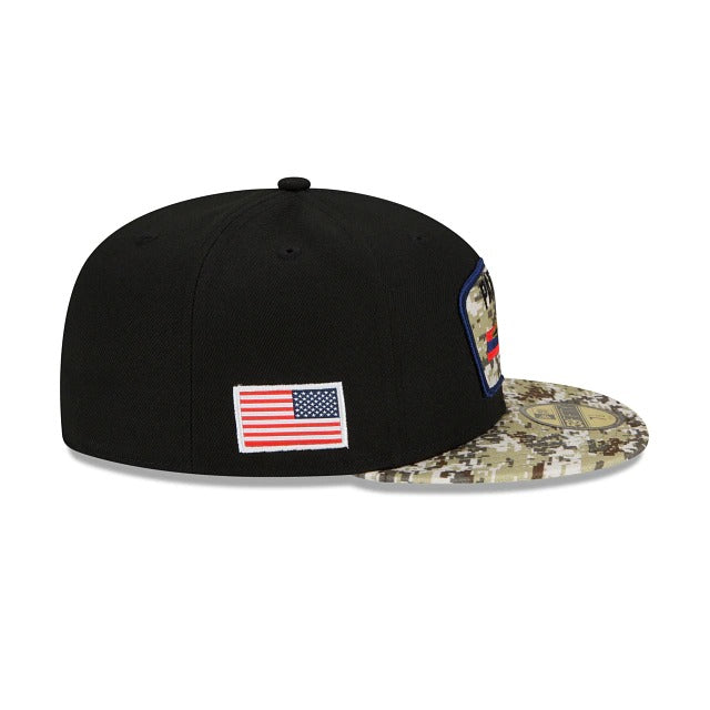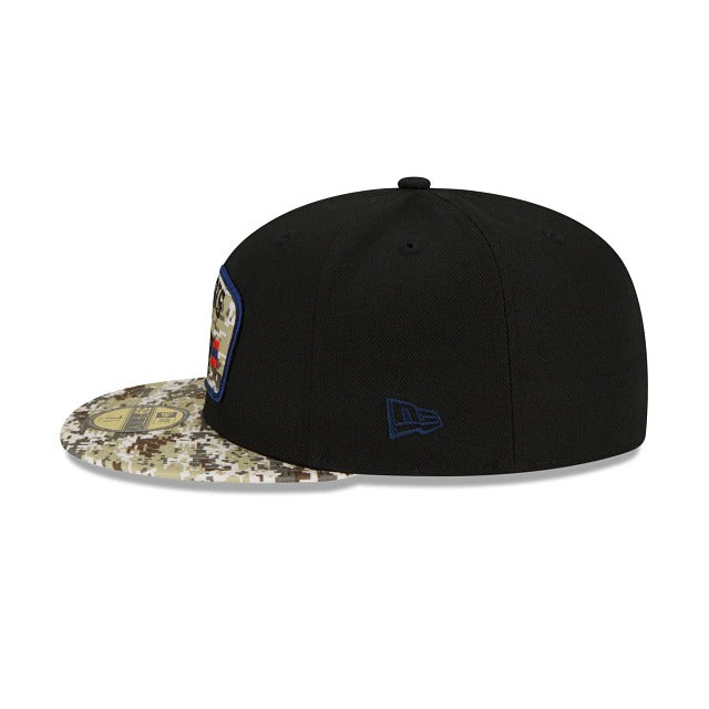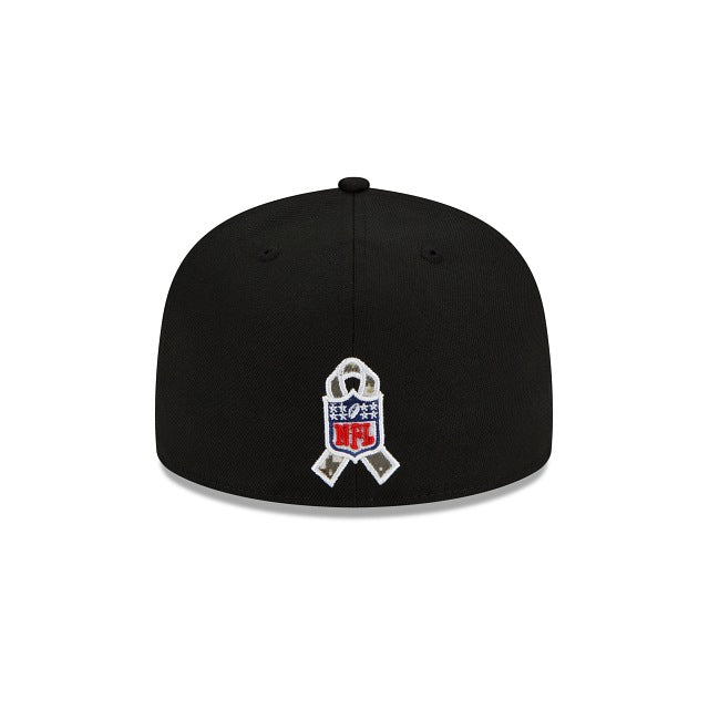 Honor our service members while supporting your favorite team in the Salute To Service 59FIFTY Fitted Cap featuring a two-tone fabrication with an embroidered team patch at the front panels, an embroidered American flag patch on the right-wear side and the official NFL Salute to Service patch on the rear.