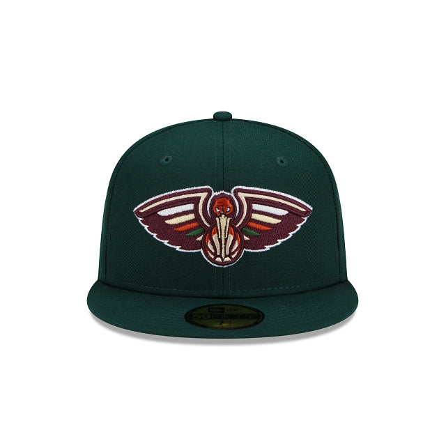 Carve some room in your rotation for the New Orleans Pelicans Turkey Dinner 59FIFTY Fitted Cap featuring natural hues of dark green, brown and tan with an embroidered Pelicans logo at the front panels and a matching NBA logo at the rear.