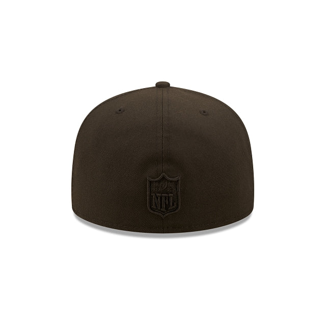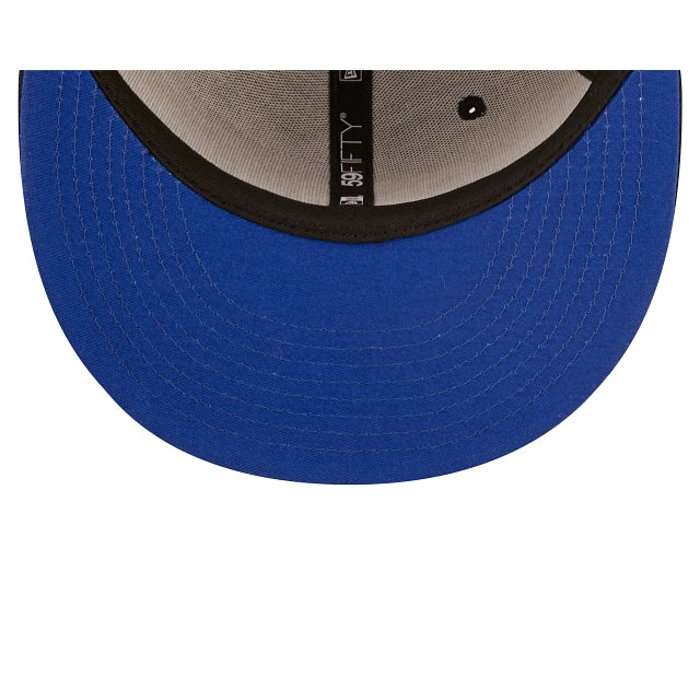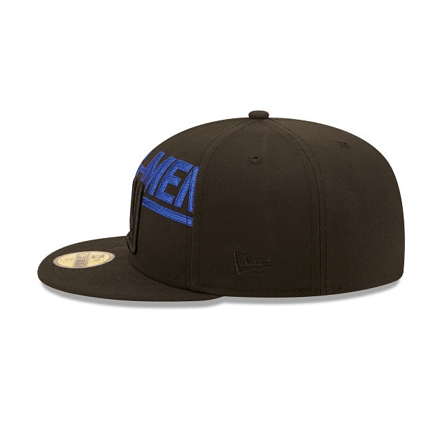 The New York Giants Logo Feature 59FIFTY Fitted Cap has an embroidered blackout Giants logo overlayed with a team colored feature logo at the front panels, and a blackout NFL Shield at the rear. Additional details include a blue undervisor.