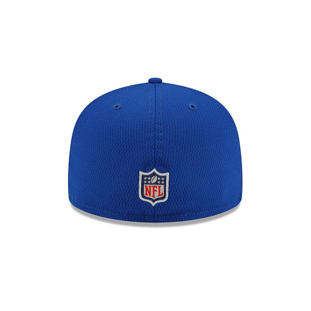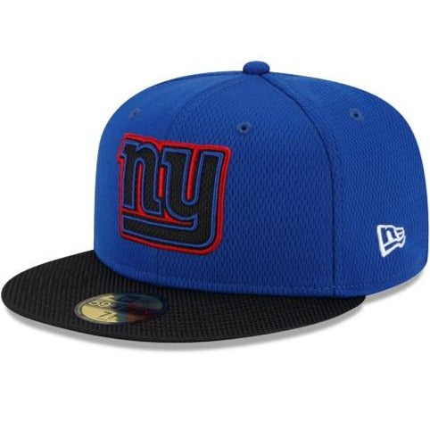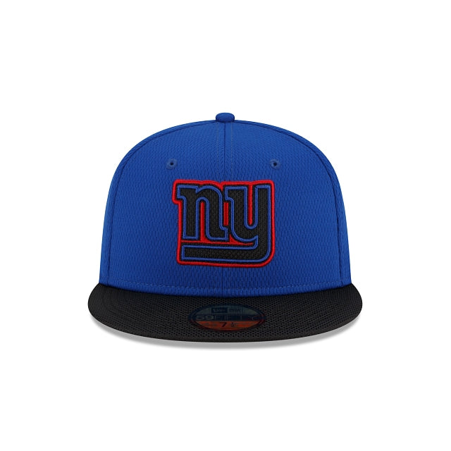 Travel in style with the New York Giants Official NFL Sideline Road 59FIFTY Fitted Cap featuring a unique two-tone dashmark fabrication with an embroidered team logo at the front panels. Team color accents and the Official NFL Shield at the rear complete the official cap that players, coaches and staff will wear on the sidelines during the 2021 NFL season.