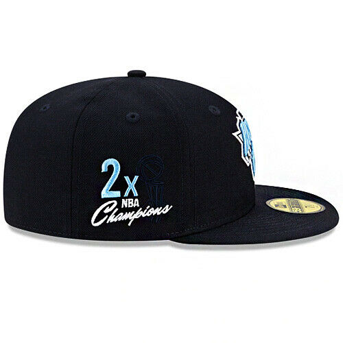 The New Era New York Knicks 2x Champions Fitted Hat has a navy blue and baby blue colorway. The structured six panel high crown, embroidered eyelets and fabric squatchee button are navy blue in color. The flat bill of the fitted is also navy blue. The front panel features the New York Knicks logo embroidered in baby blue and white threads with black threads outlined within the logo. The left panel displays the New Era logo embroidered in the classic white thread and the right panel features the 2x Champions side patch embroidered in baby blue and white threads. This fitted hat is a highly sought after fitted and hard to come by.