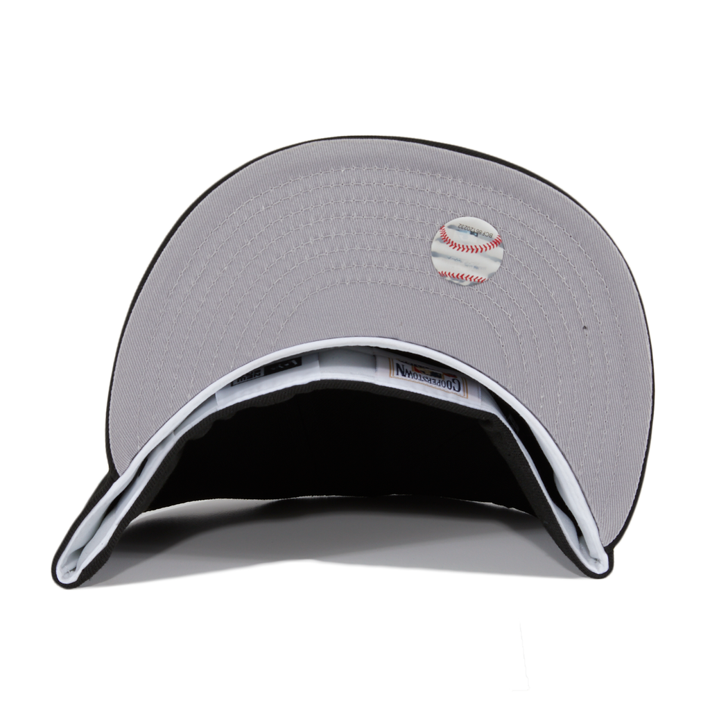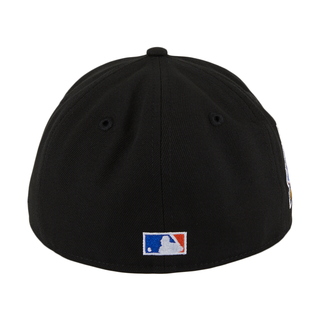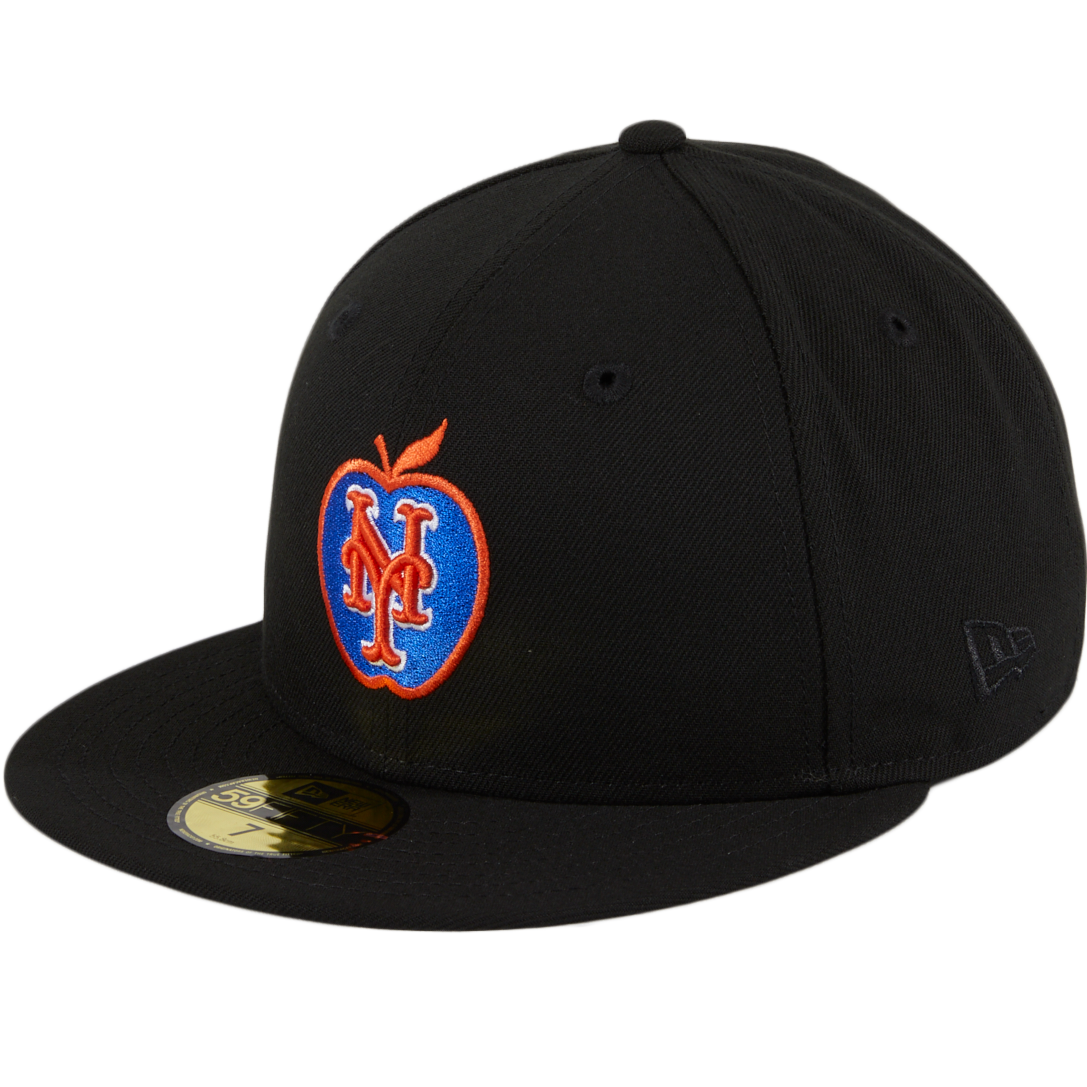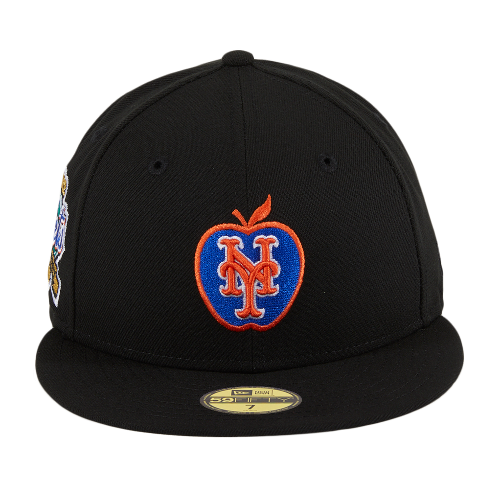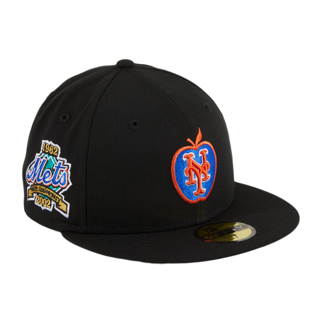 The New Era New York Mets Black 1982 - 2002 Anniversary 59FIFTY Fitted Hat is a Hat Club exclusive. The fitted has a black, royal blue and orange colorway. The six panel structured crown, embroidered eyelets and fabric squatchee button are black. The flat bill of the fitted is also black with a grey undervisor. The front panel features the Mets logo inside a big apple embroidered in royal blue and orange thread. The right panel features a 1982 - 2002 Anniversary side patch.