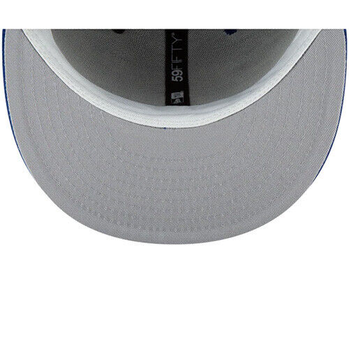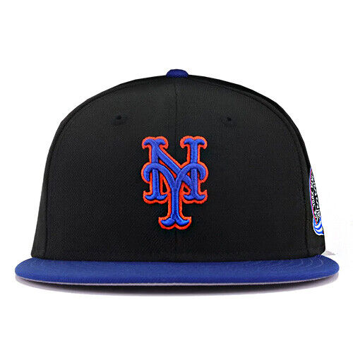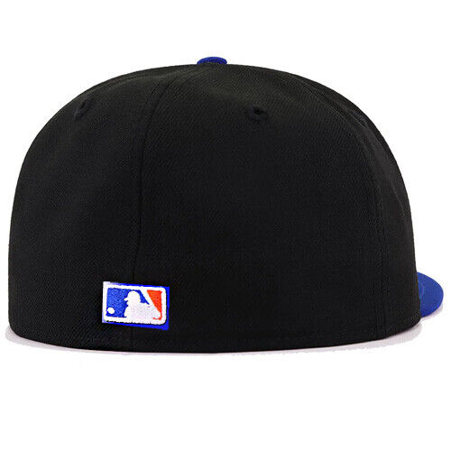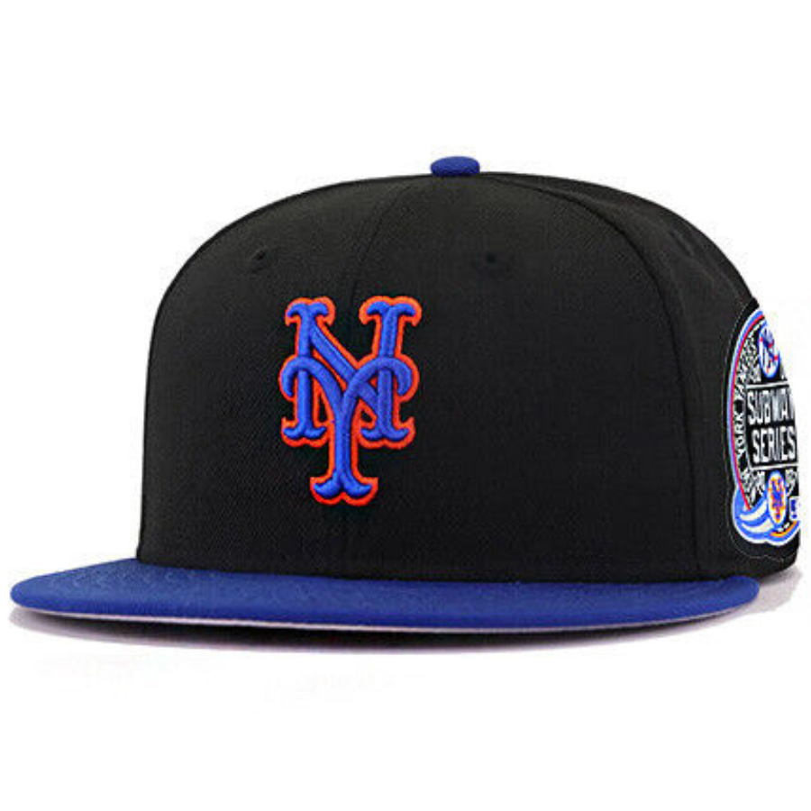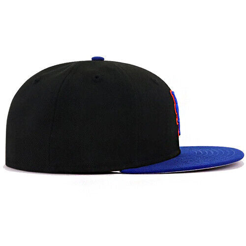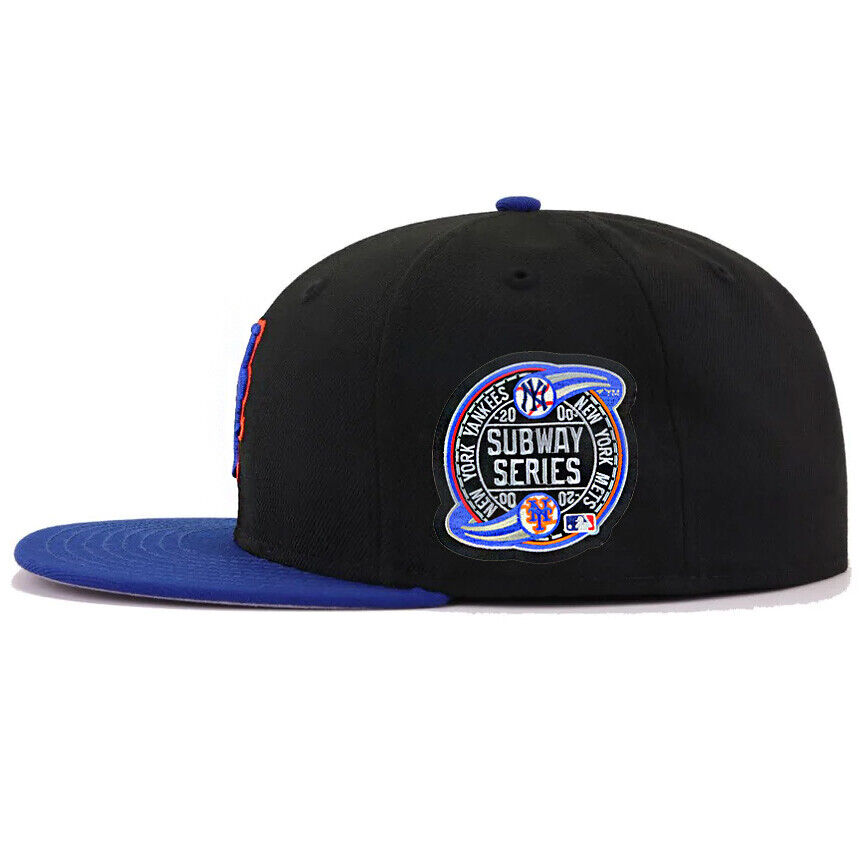 This New Era New York Mets 59FIFTY fitted hat has a black six panel structured high crown and embroidered eyelets with a royal blue fabric squatchee button. The flat bill of the fitted is also royal blue. The front panel features the New York Mets logo embroidered in blue and orange colorway stitching, a 2000 Subway Series side patch on the right panel and the official MLB batterman logo on the rear-crown.