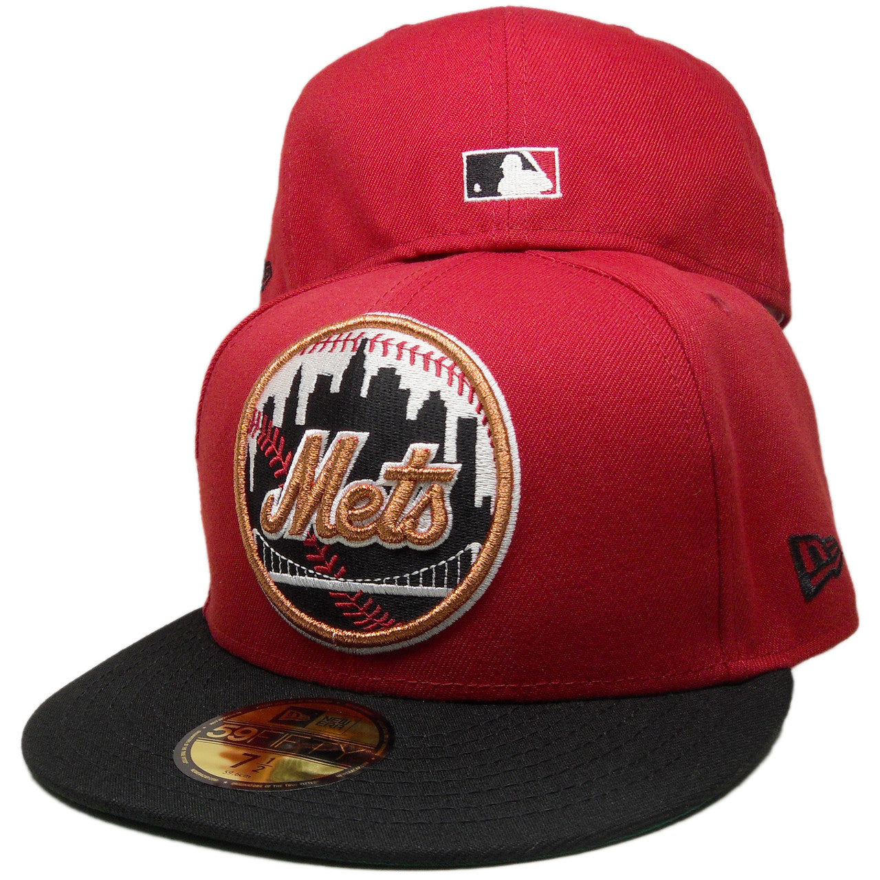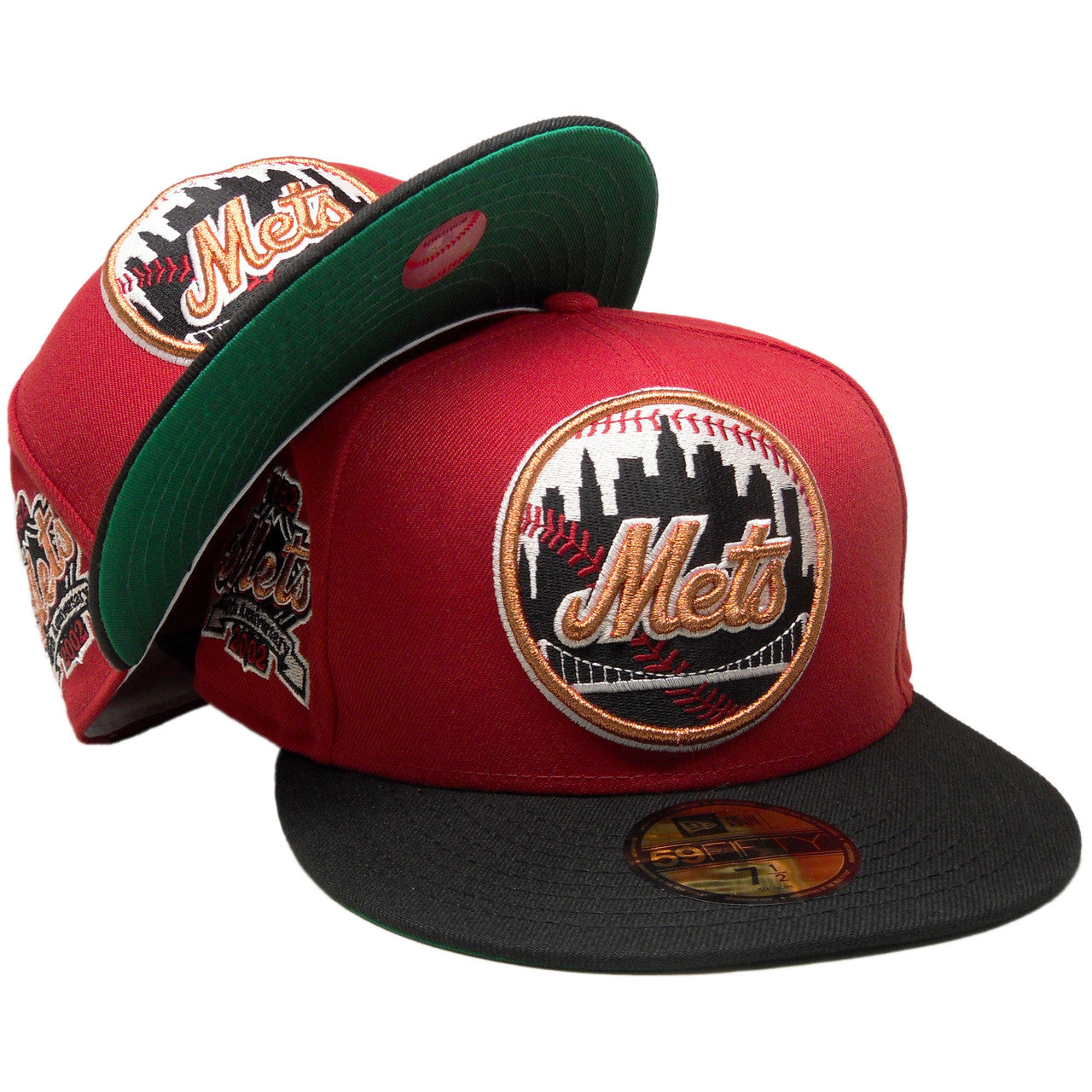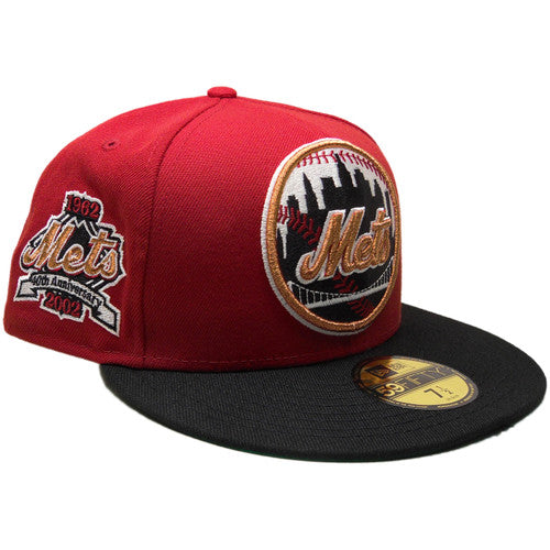 This New Era New York Mets 59FIFTY fitted hat was released by Ecapsunlimited. The fitted has a cardinal red six panel structured high crown, embroidered eyelets and fabric squatchee button. The fitted cap also has a black flat bill with a kelly green undervisor and white sweatband. The front panel features the New York Mets logo embroidery and a 40th Anniversary side patch embroidery on the right panel. The left panel of the fitted displays the New Era logo and the official MLB Batterman logo embroidery on the rear crown.