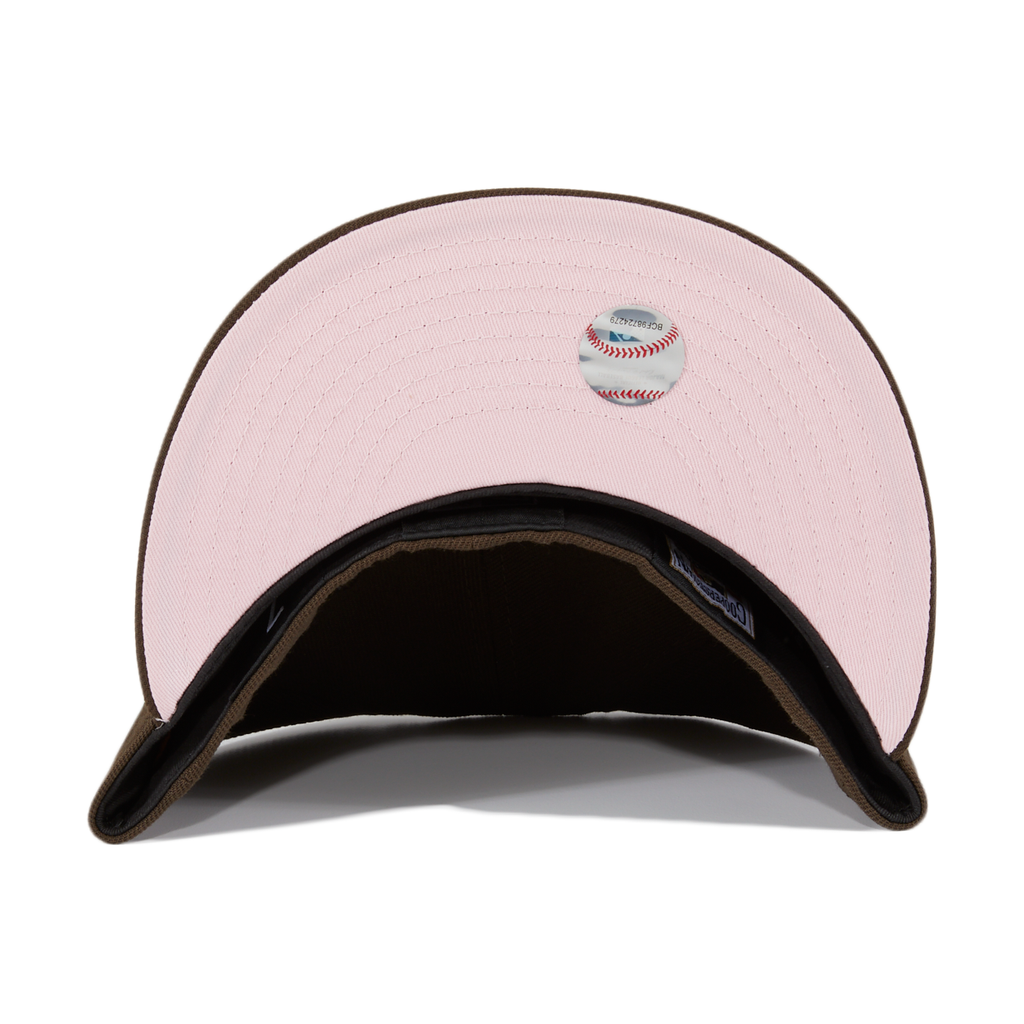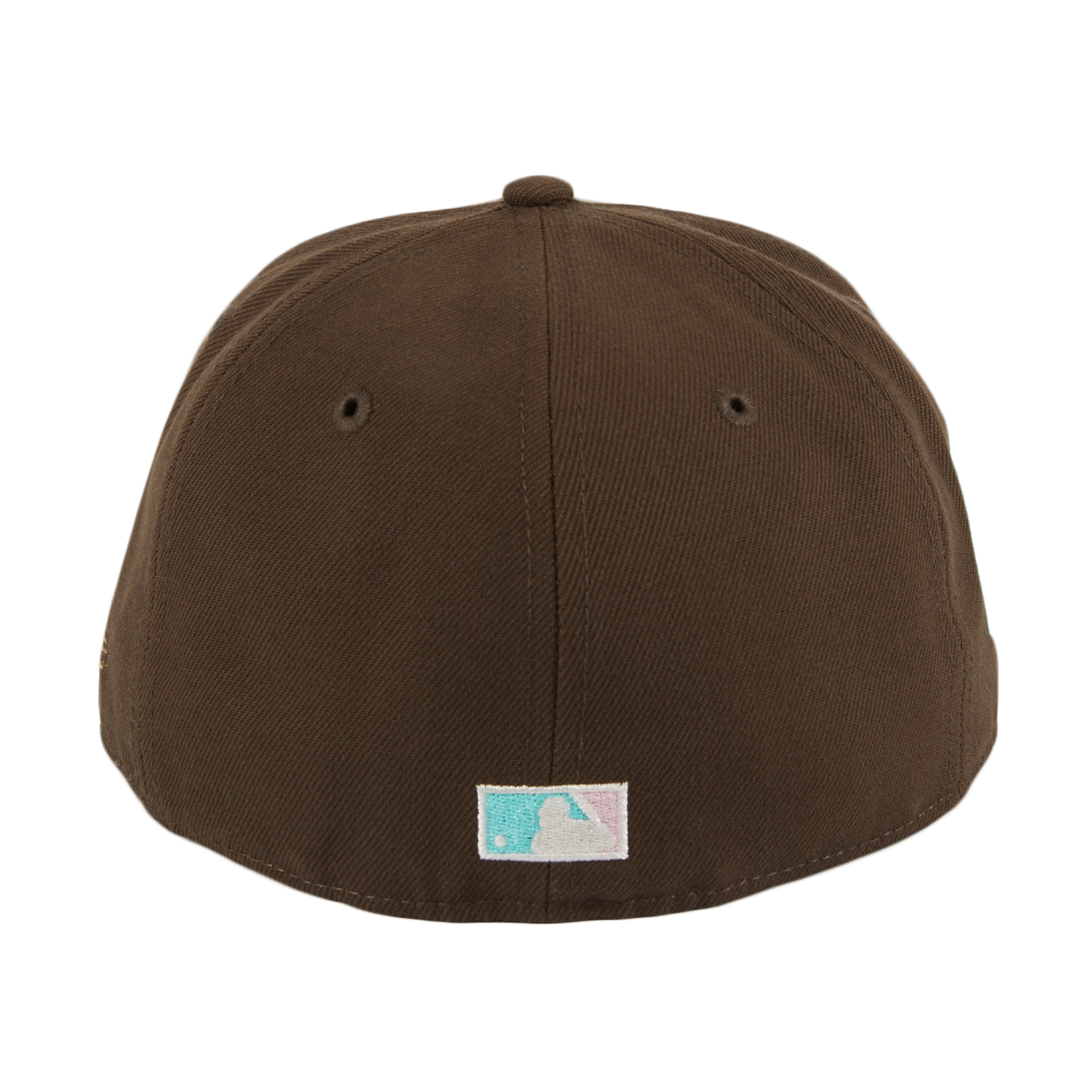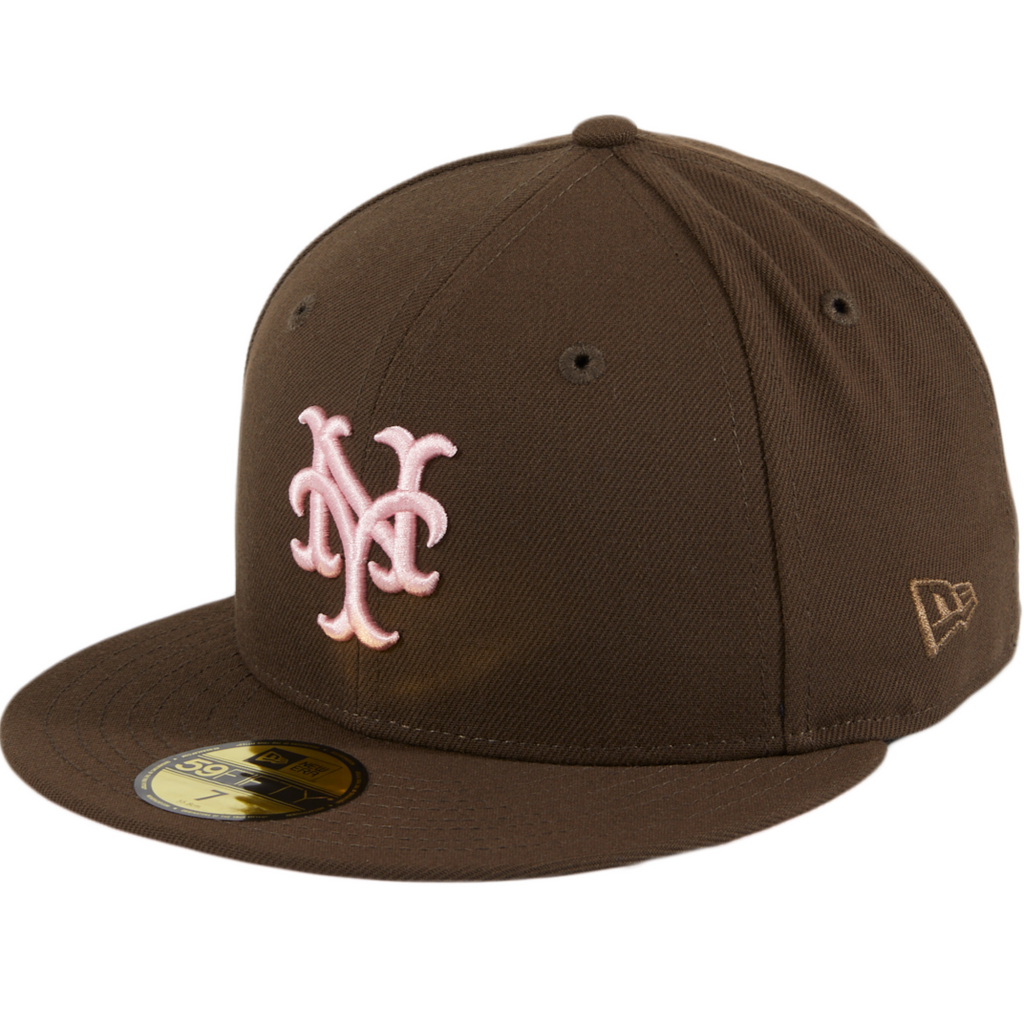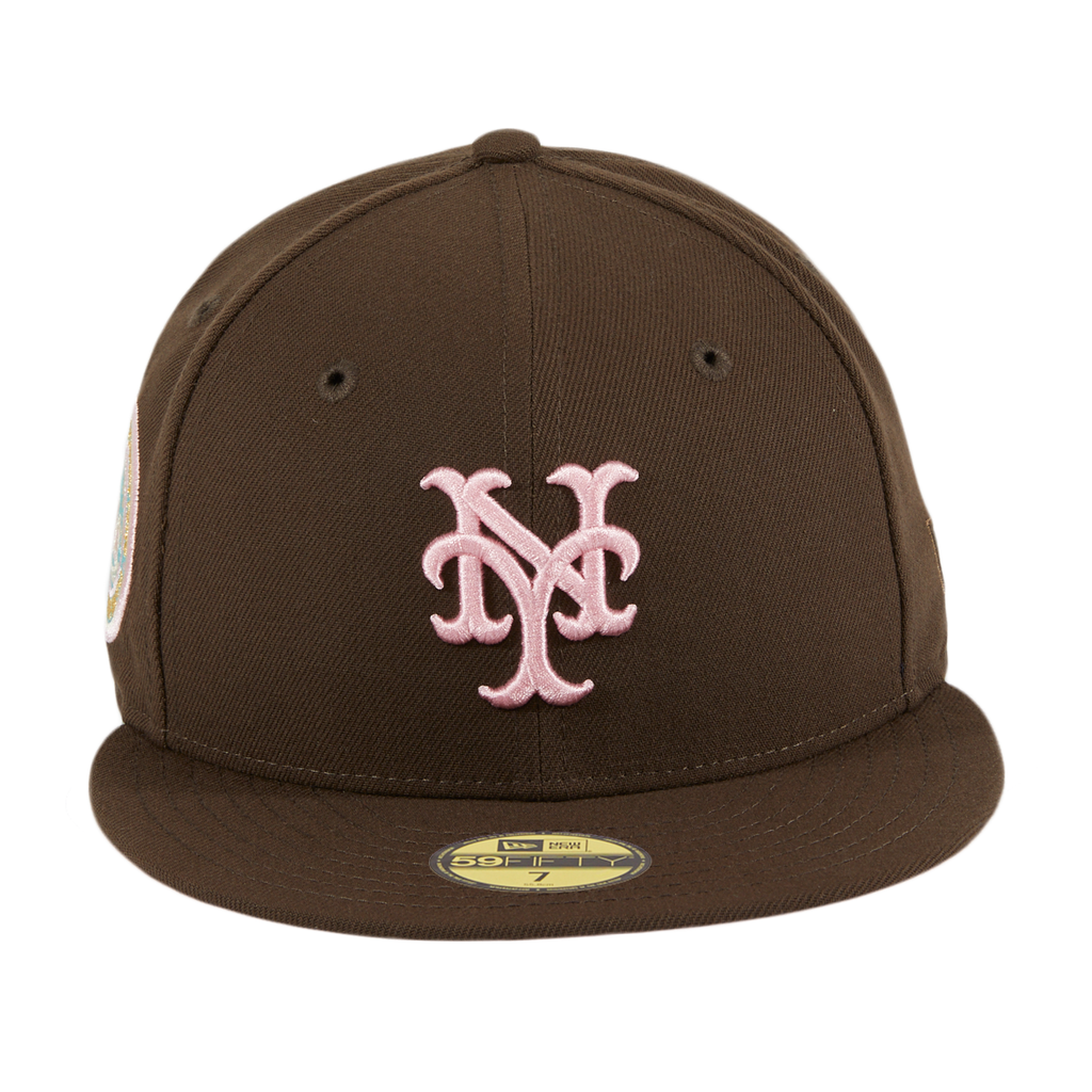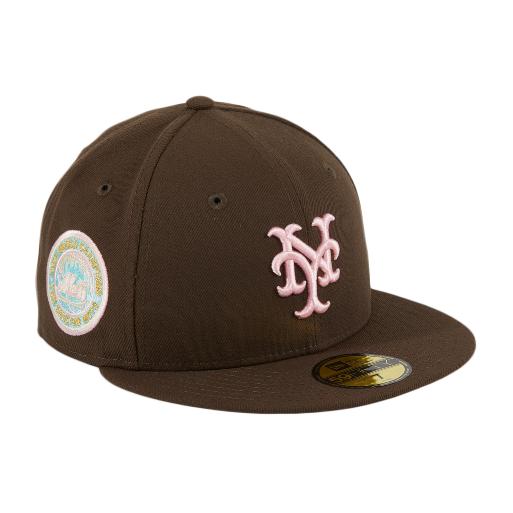 This New Era New York Mets Spumoni fitted hat is a Hat Club Exclusive with a dark brown & pink colorway with mint green accents. The fitted features a brown six panel structured high crown, embroidered eyelets and fabric squatchee button. The flat bill of the fitted is also brown with a soft pink undervisor. The front panel features the MLB teams logo and a side patch on the right panel.