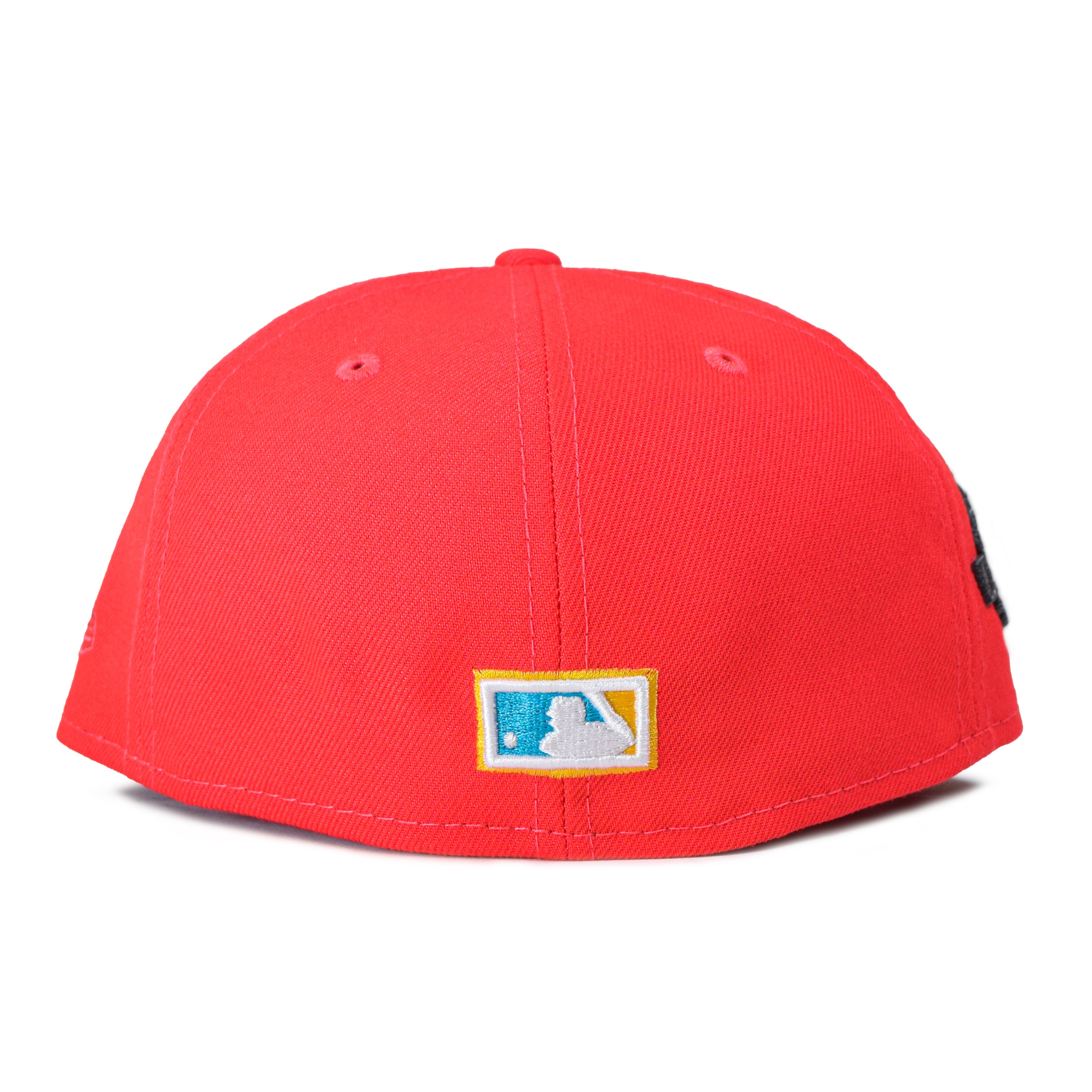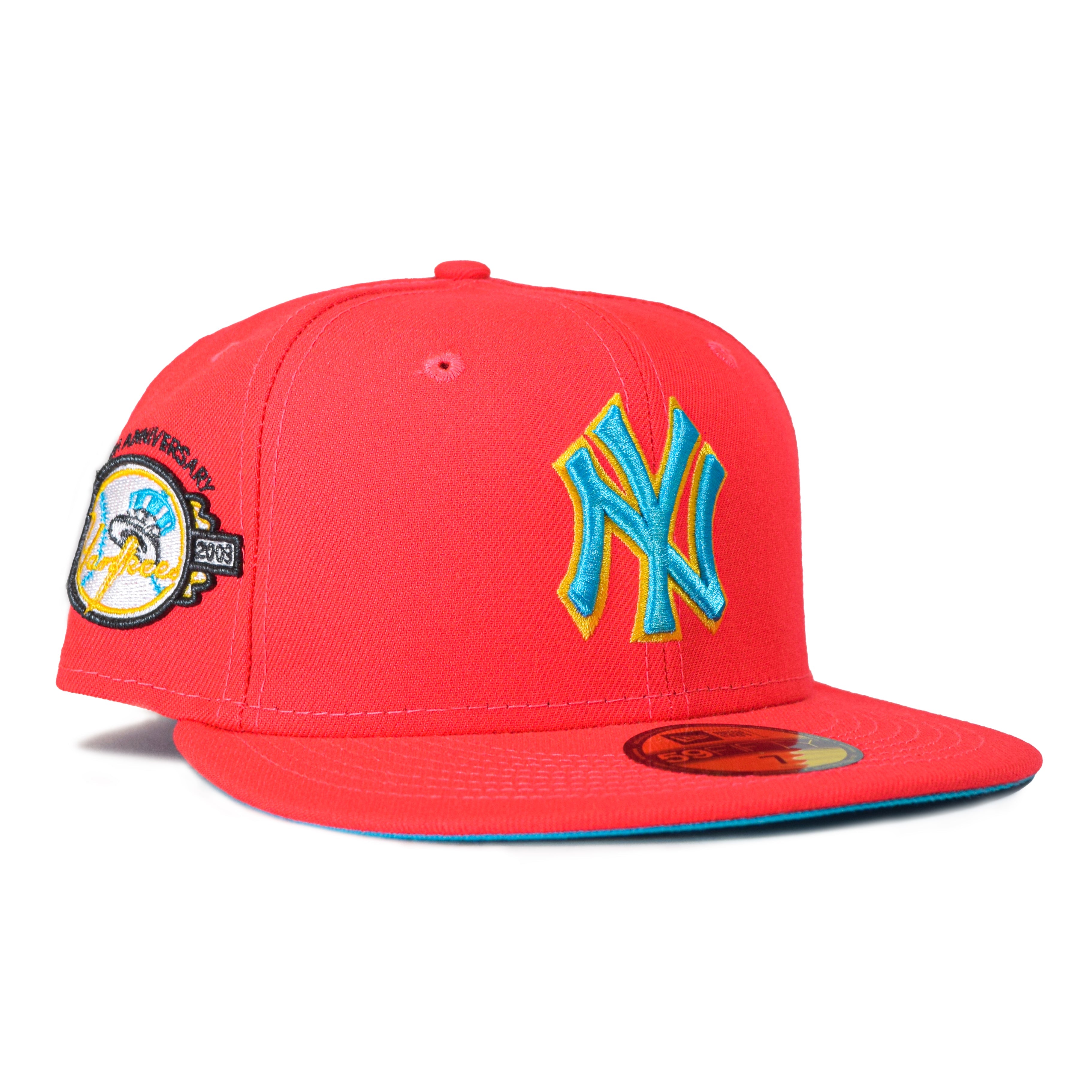 This New Era New York Yankees 'Heat Wave 59FIFTY fitted hat has a lava red six panel structured high crown, embroidered eyelets and fabric squatchee button. The fitted cap also has a lava red flat bill with a teal undervisor and black sweatband. The front panel features the New York Yankees logo embroidered in orange and teal threads with a side patch embroidery on the right panel. The left panel of the fitted displays the New Era logo with the official MLB logo embroidery on the rear crown.