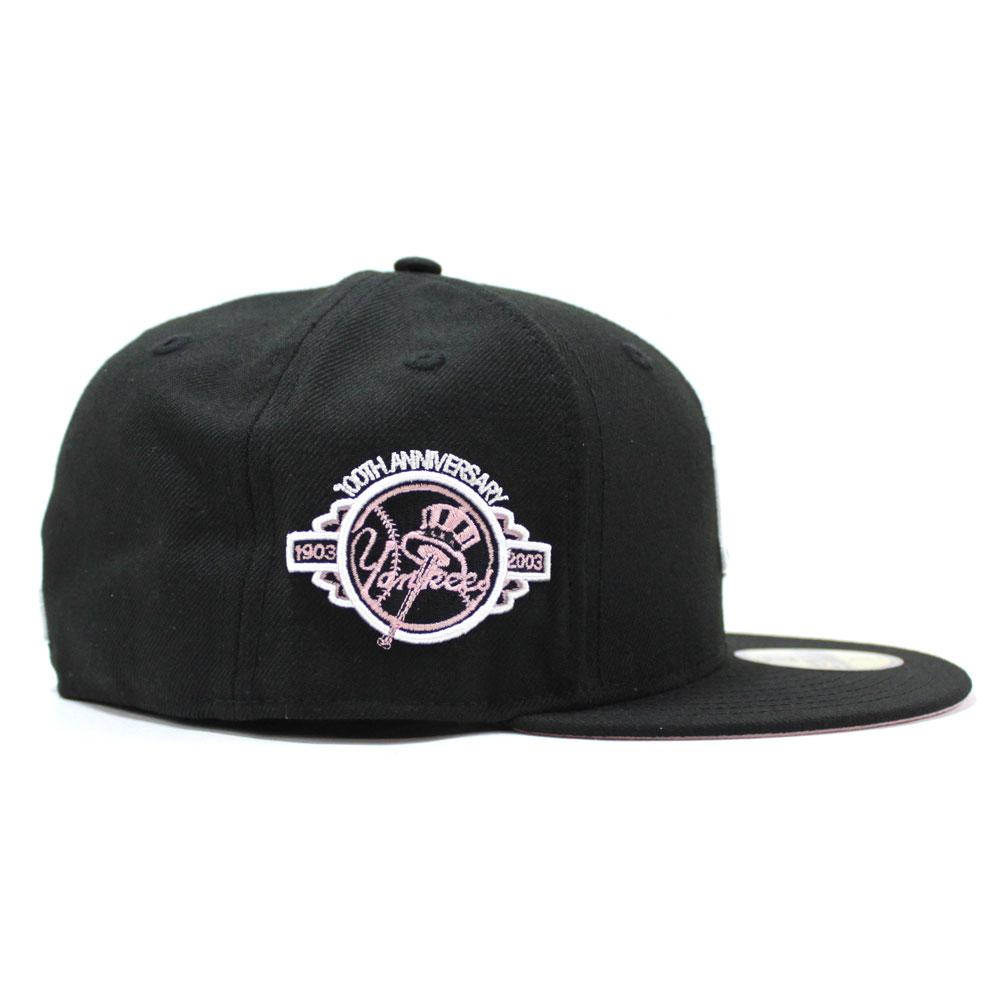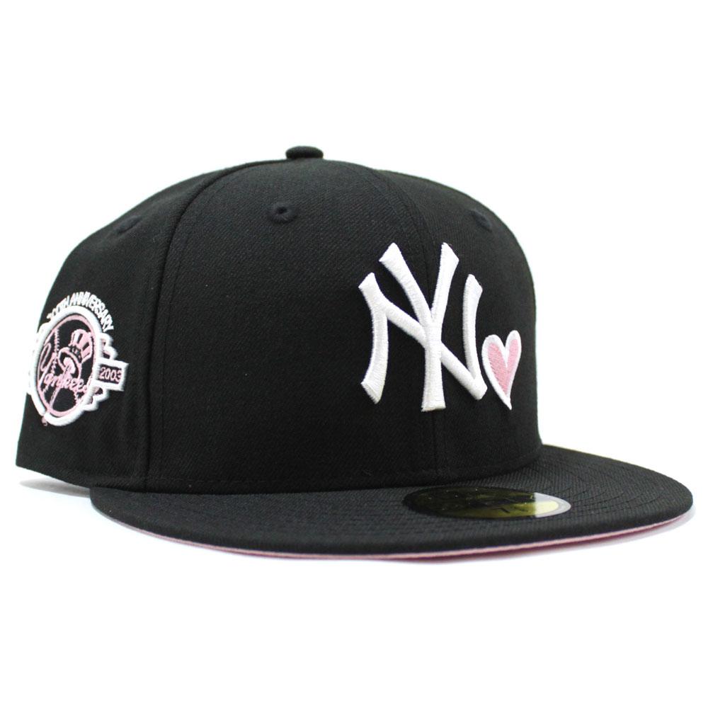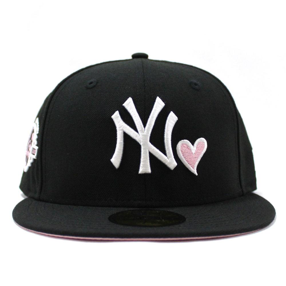 This New Era New York Yankees 59FIFTY fitted hat has a black six panel high crown, embroidered eyelets and fabric squatchee button located at the top of the hat. The flat bill of the fitted cap is black with a soft pink undervisor. The front panel features the NY Yankees logo embroidered in white thread. A pink heart with white white outline is embroidered directly to the left of the primary logo. The right panel features a 100th Anniversary side patch.