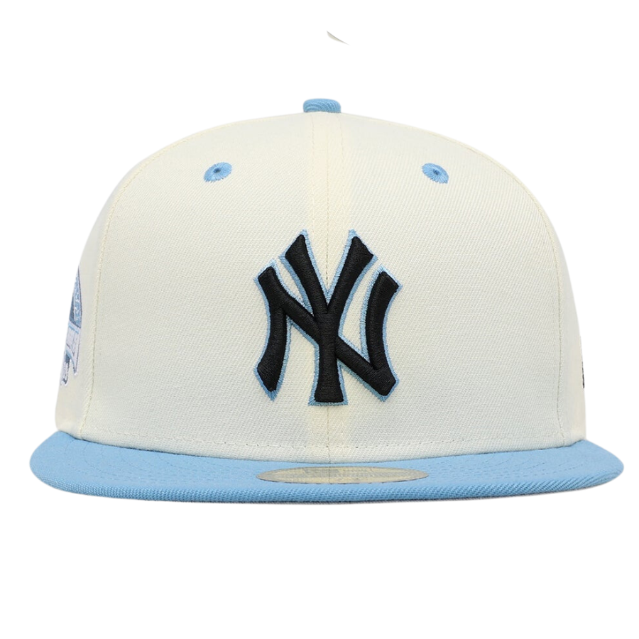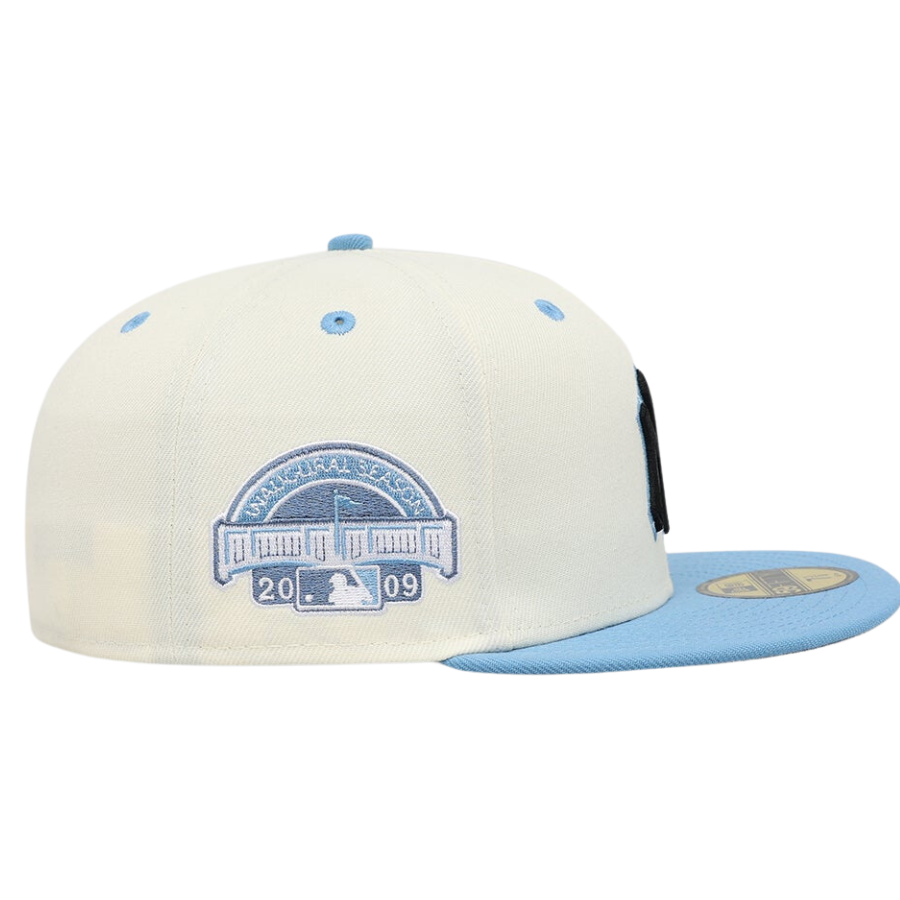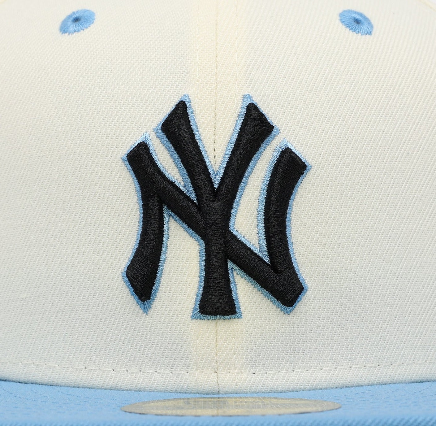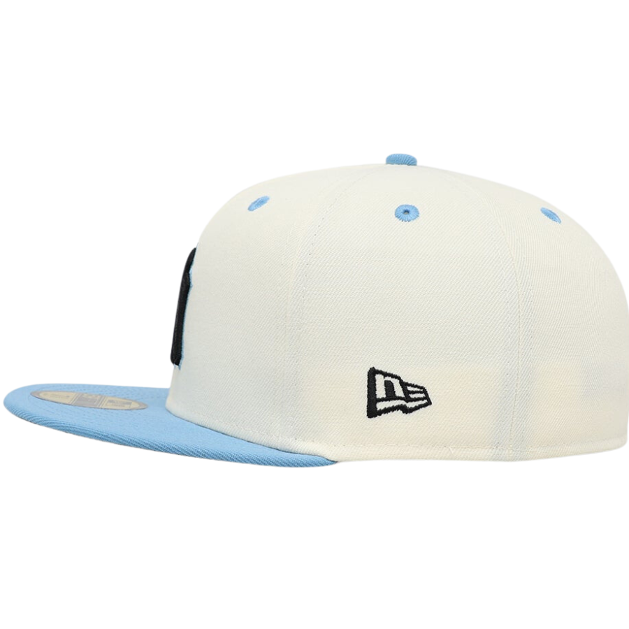 This New Era New York Yankees 'Chrome University Blue' 59FIFTY Fitted White was released by Culture Kings. The fitted has a chrome/white six panel structured high crown, university blue embroidered eyelets & fabric squatchee button. The flat bill of the fitted cap is also university blue with a grey bottom undervisor and a white sweatband. The front panel features the New York Yankees logo embroidery with a side patch on the right panel. The left panel of the fitted displays the New Era logo and the official MLB Batterman logo on the rear-crown .
