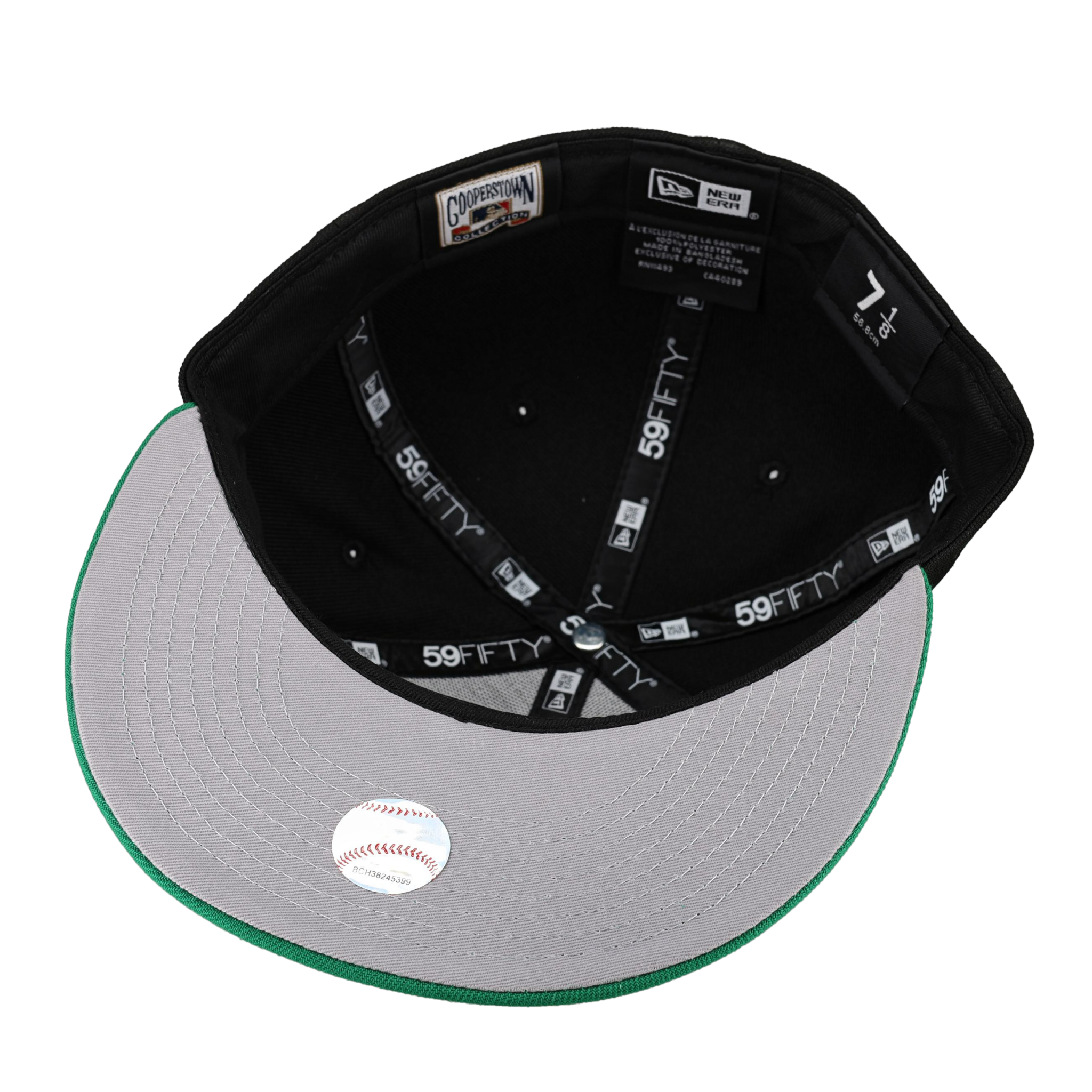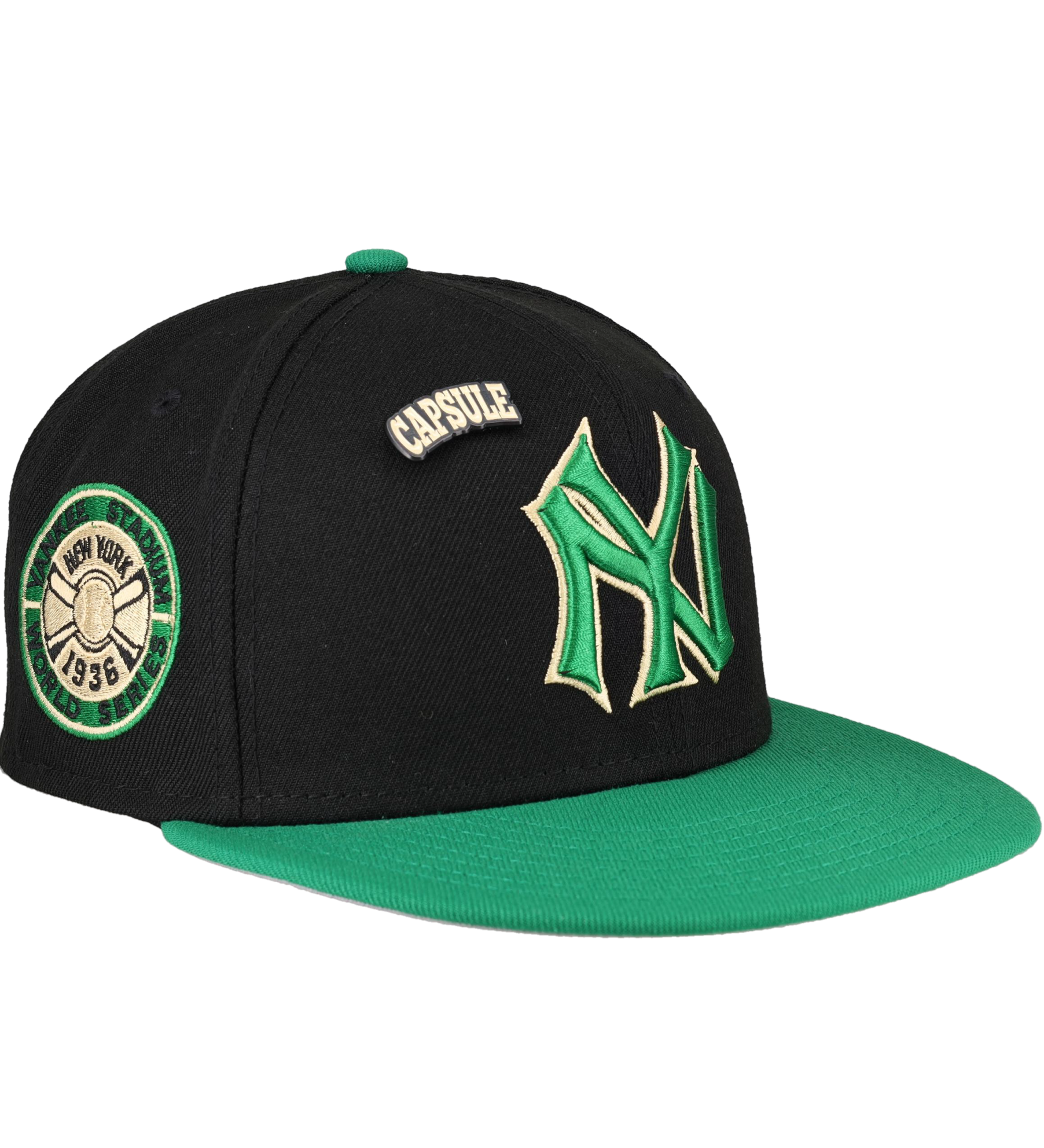 This New York Yankees 59FIFTY fitted hat was released by Capsule Hats. The fitted has a black six panel structured high crown and embroidered eyelets with a green fabric squatchee button. The fitted cap also has a green flat bill with a grey undervisor and black sweatband. The front panel features the New York Yankees logo embroidery and a 1936 World Series side patch on the right panel. The left panel of the fitted displays the New Era logo and the official MLB Batterman embroidery on the rear crown.