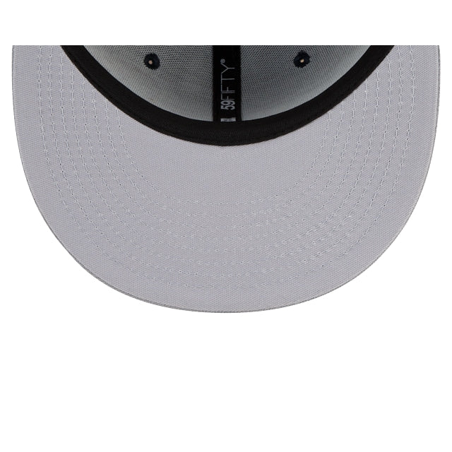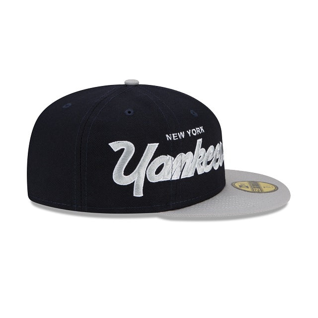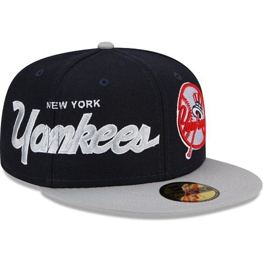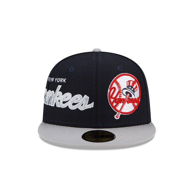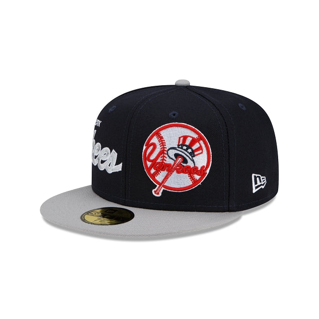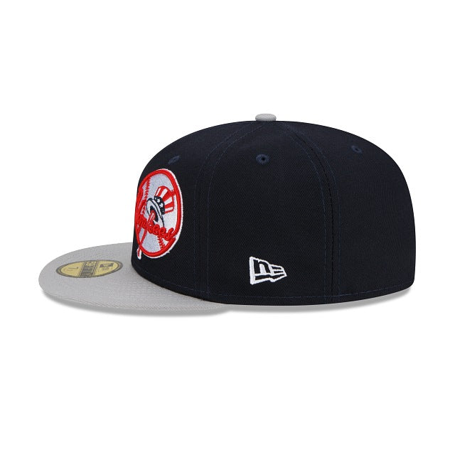 The New York Yankees Double Logo 59FIFTY Fitted Cap features a two tone team fabrication with an embroidered Yankees logo at the front left-wear panel, complimented by a team script at the right-wear side and a matching MLB Batterman logo at the rear.