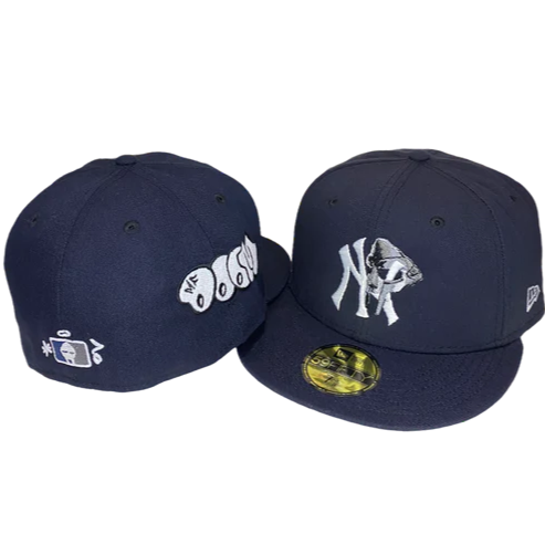 MF Doom fitted hat has a navy blue six panel structured high crown, embroidered eyelets and fabric squatchee button. The flat bill of the fitted cap is also navy blue. The front panel features the NY Yankees logo embroidered in white thread with MF Doom, a British-American rapper, mask embroidered in grey threads. The right panel features the script "Doom" embroidered in creative letters. This New York Yankees fitted hat is a custom design fitted by the owner as a tribute to rapper whom passed away October 31, 2020.