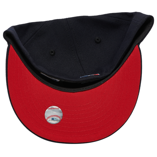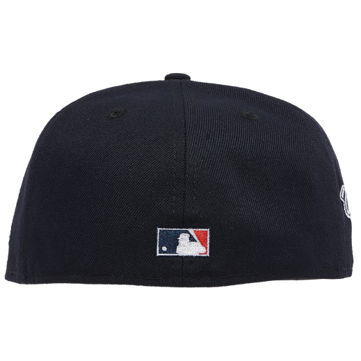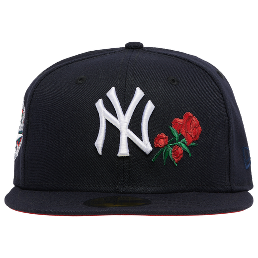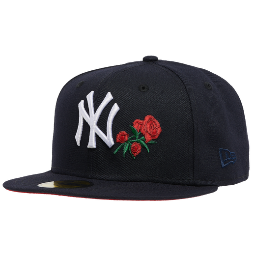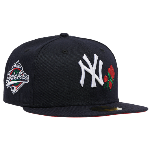 This New Era New York Yankees fitted hat has a navy six panel structured high crown, embroidered eyelets, fabric squatchee button and flat bill. The undervisor of the fitted cap is red with a black sweatband. The front panel features the New York Yankees logo embroidered in white thread with a red rose embroidered patch. The right panel features a World Series side patch embroidery.