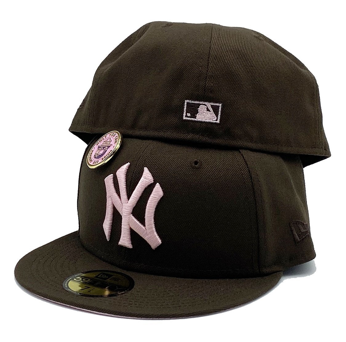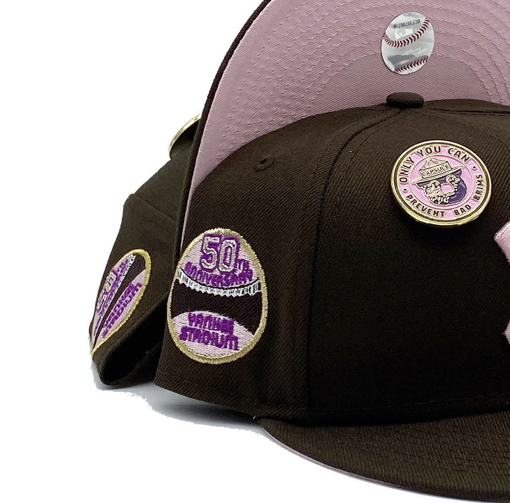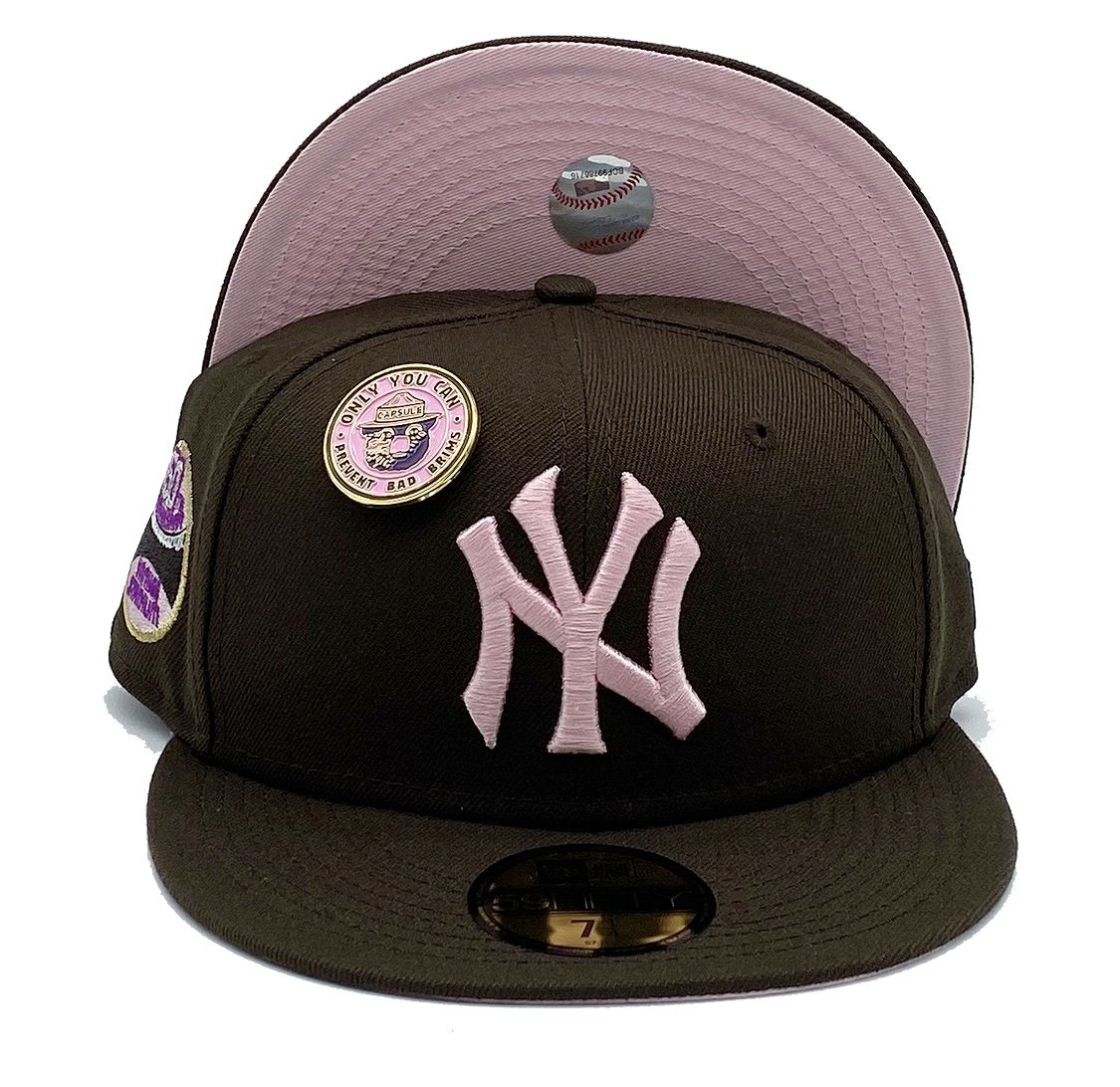 The New Era New York Yankees No Bad Brims fitted hat is a Capsule Hat exclusive. The fitted cap features a dark brown six panel structured high crown, embroidered eyelets and fabric squatchee button. The flat bill of the fitted is also dark brown with a soft pink undervisor and black sweatband. The front panel features the Yankees logo embroidered in soft pink thread. The right panel features a 50th Anniversary side patch embroidered in purple, soft pink and gold colorway.