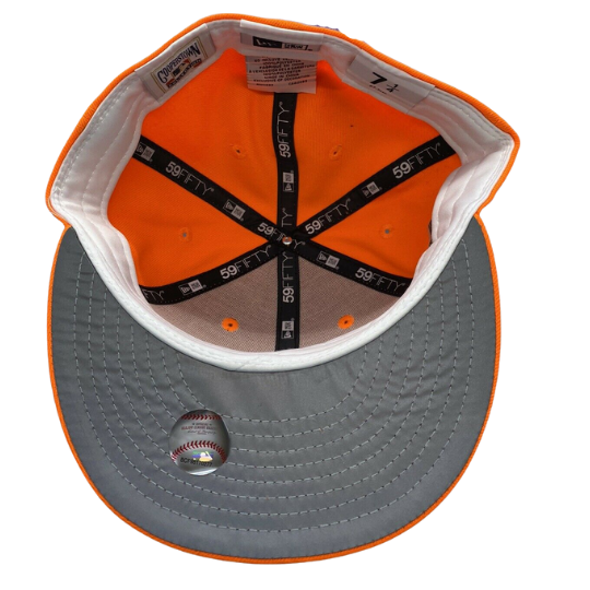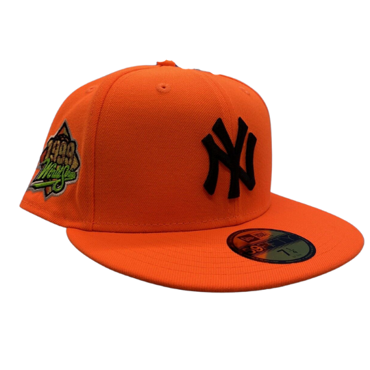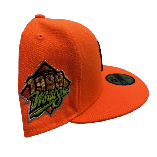 The New Era New York Yankees Orange "Safety Pack" 59FIFTY fitted hat is a My Fitteds exclusive. The fitted has an orange six panel structured high crown, embroidered eyelets and fabric squatchee button. The flat bill of the fitted is also orange with a grey bottom undervisor with a white sweatband. The right panel features a 1999 Wolrd Series side patch.