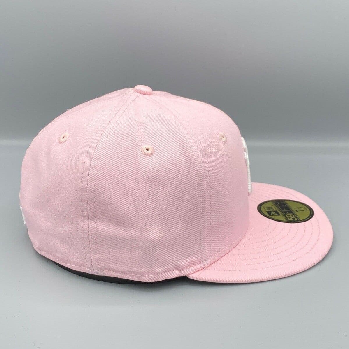 The New Era New York Yankees Pink 59Fifty Fitted Hat has a pink and white colorway. The crown of the New York Yankees fitted, the embroidered eyelets, the fabric squatchee button and the flat brim are all pink with a grey bottom undervisor. The front displays the New York Yankees team logo in white thread. The iconic "Fly Your Own Flag" New Era logo is embroidered in white threads and the official MLB batterman logo is also embroidered in white thread.