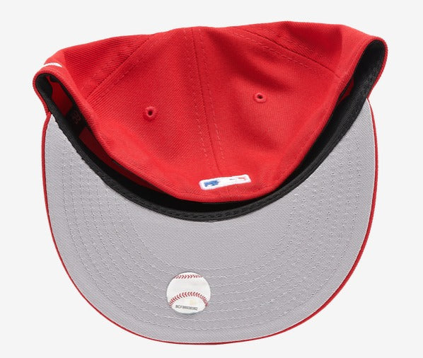 Puerto Rico Flag fitted hat has a full red six panel high crown including the fabric squatchee button ontop and the embroidered eyelets. The flat bill of the fitted is also red with a grey bottom undervisor. The front panel features the NY Yankees logo embroidered in white thread. Directly to the left of the primary logo is an embroidery of the Puerto Rico flag embroidered in red, white and blue thread.