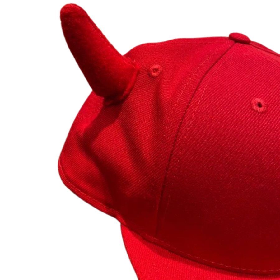 This is a New Era New York Yankees Ryder Studio Devil Horn fitted hat. The fitted has a red structured six panel high crown, embroidered eyelets and fabric squatchee button. The flat bill of the fitted is also red. On both left and right panels of the fitted are devil horns protruding from the crown.