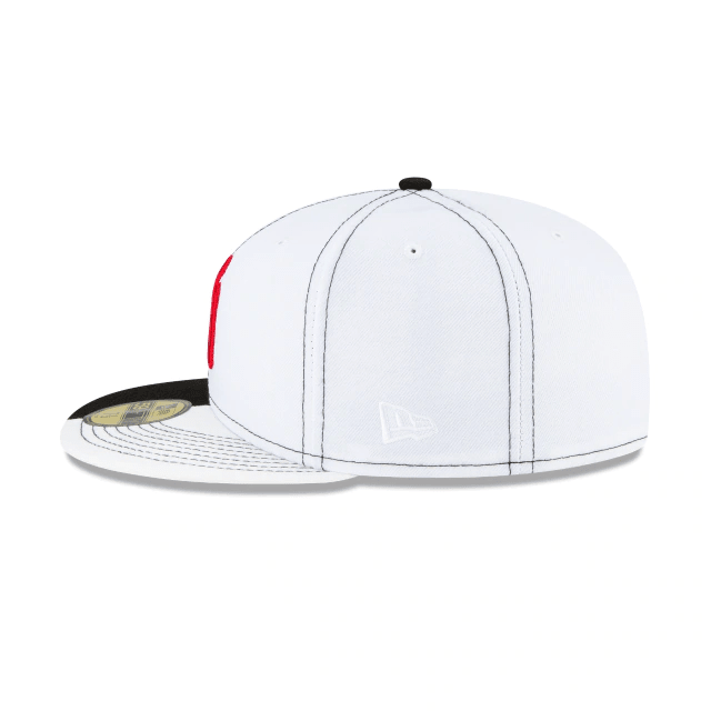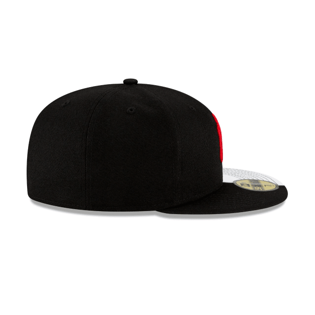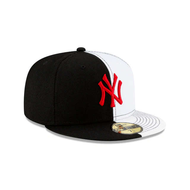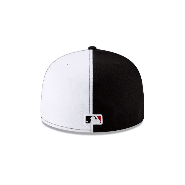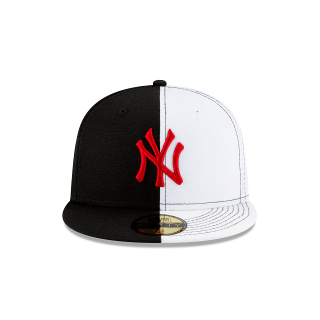 The official name given to this style fitted hat by New Era Cap Company is "Split Crown". We however, refer to this style as the Scarface Theme fitted hat because of the color scheme and how the colors are presented. The New York Yankees Scarface Theme 59Fifty fitted hat is half black on the right side of the hat and half white on the left side of the hat. The squatchee button located at the top is black. The over brim is half black and half white while the under brim is entirely white. The front panel displays the MLB team logo embroidered in a red letter. The back of the hat displays the official MLB batterman logo and the left side is the embroidery of the iconic New Era flag in white threads. The "59Fifty" wording of the interior taping and sweatband of the hat are in gold accents.