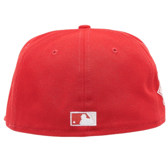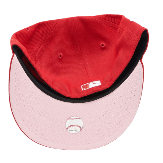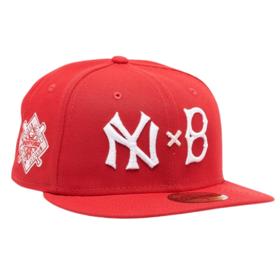 This New Era New York Yankees X Brooklyn Dodgers fitted hat has a full red high crown including the fabric squatchee button and eyelets. The flat bill of the fitted is also red with a soft pink bottom undervisor. The front panel features a duo logos of Both New York Yankees and Brooklyn Dodgers. The right panel features a side patch and of course the official MLB Batterman logo is embroidered on the back of the crown.
