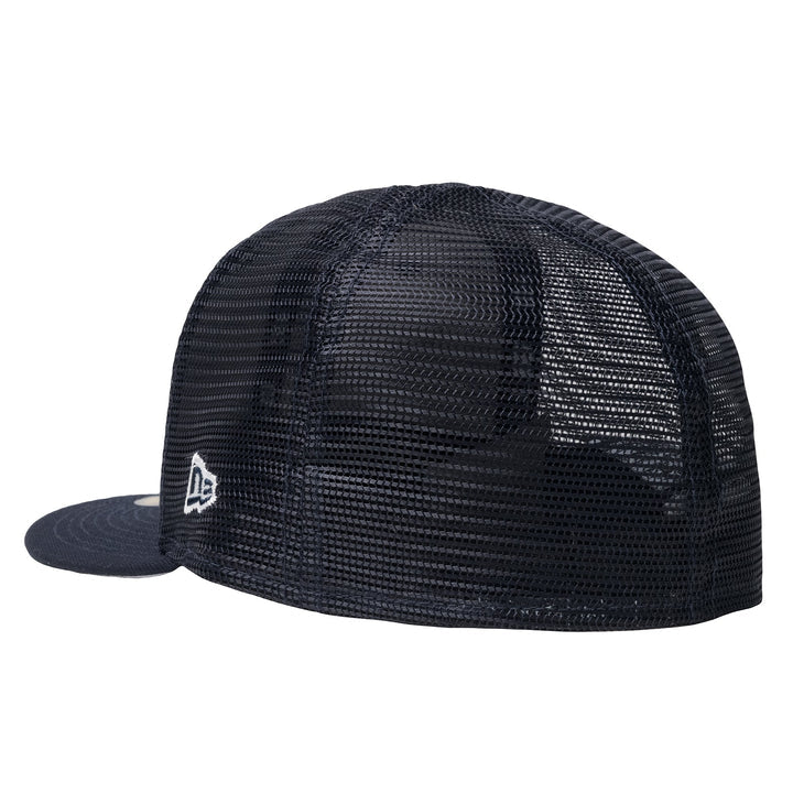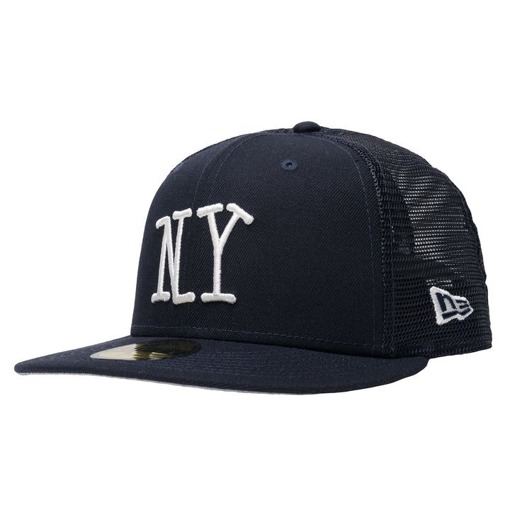 This New Era "NY" 59FIFTY fitted cap has a navy blue six panel structured high crown , embroidered eyelets, fabric squatchee button and flat bill. The back of the high crown is mesh back. The front panel features the lettermarks "NY" for New York embroidered in white thread. This fitted is a Stussy exclusive cap.