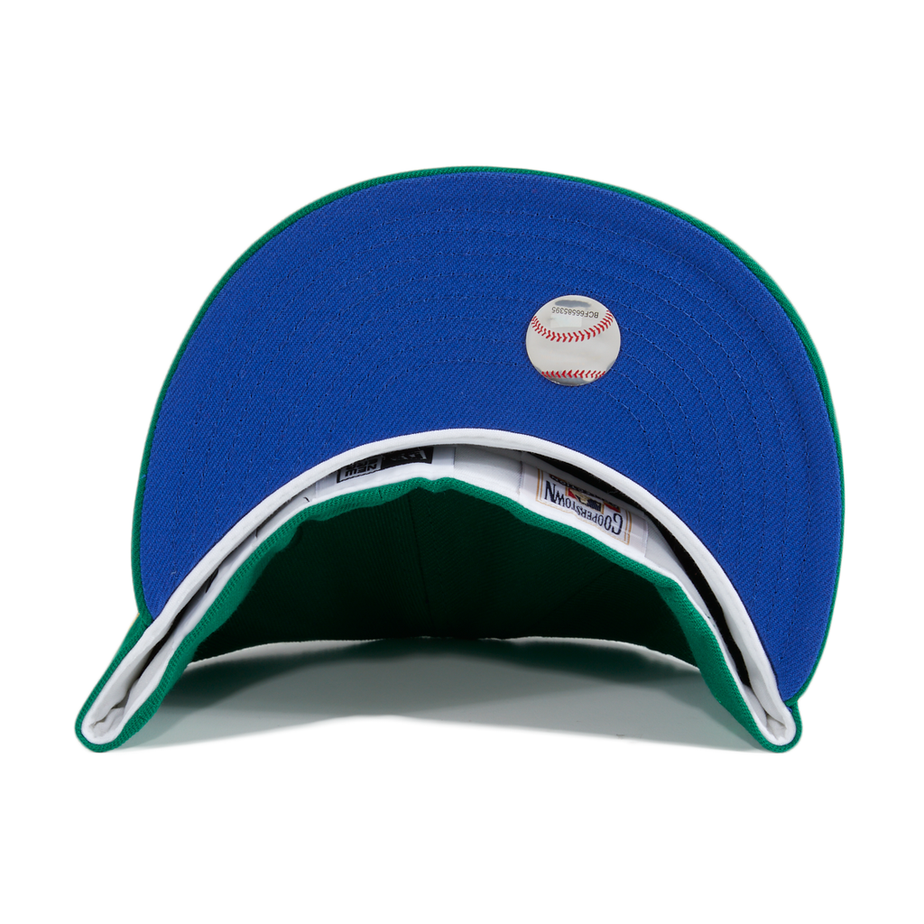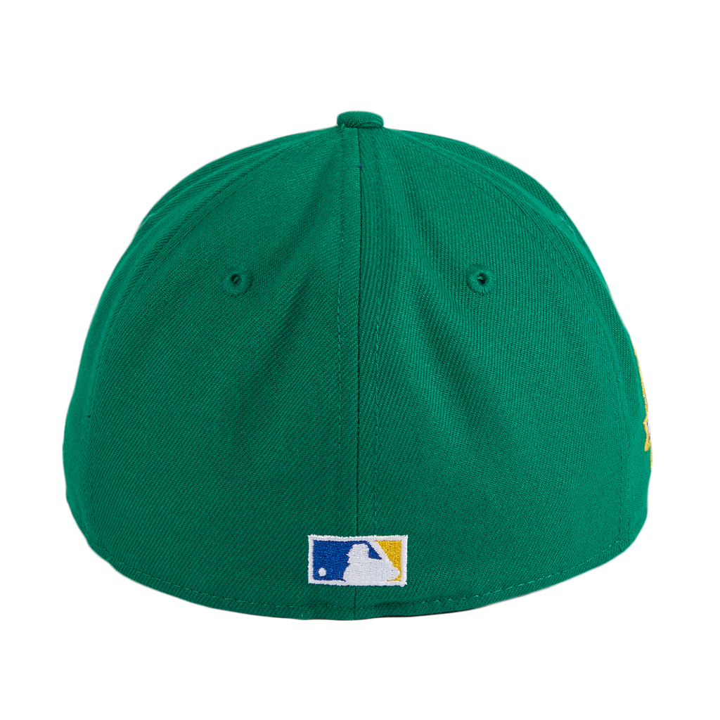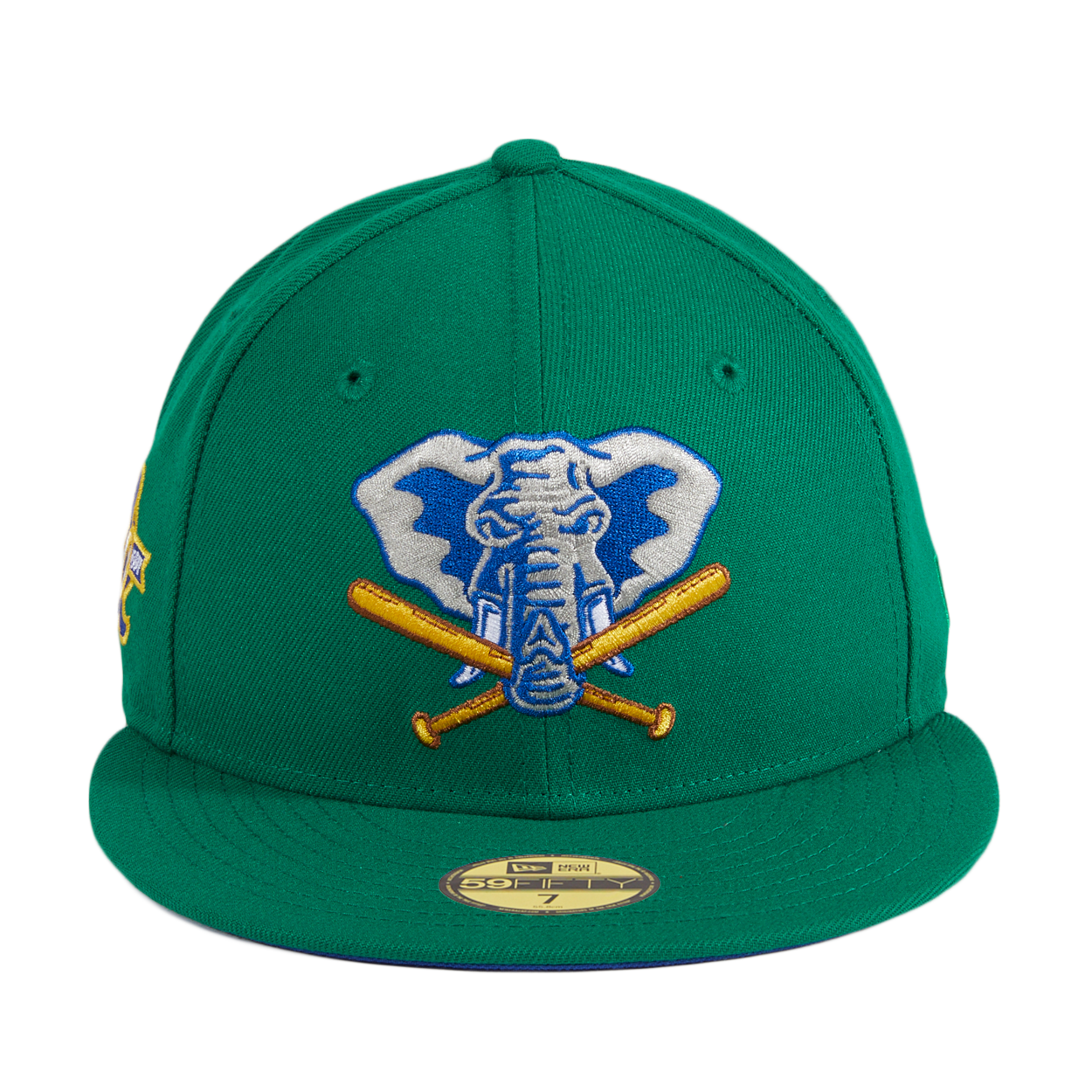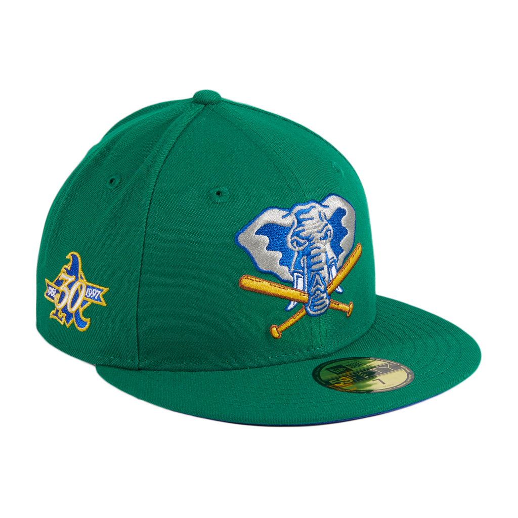 This New Era Oakland Athletics 59FIFTY fitted hat is a Hat Club exclusive part of their Breakaway collection. The fitted has a green high crown, embroidered eyelets, fabric squatchee button and flat bill with a blue bottom undervisor and white sweatband.  The front panel features the Athletics logo and a 30th Anniversary side patch on the right panel.