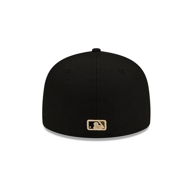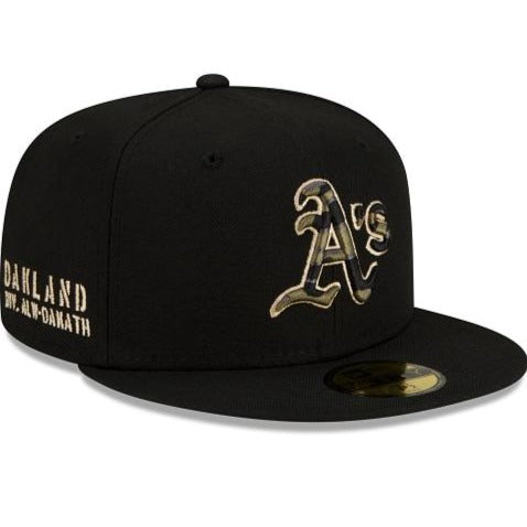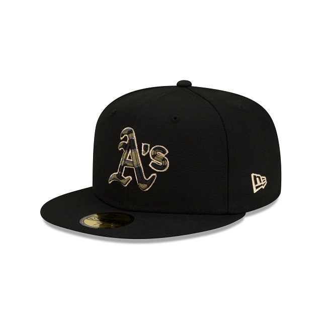 The Oakland Athletics Camo Undervisor 59FIFTY Fitted Cap features a camo filled Athletics logo embroidered at the front panels with a team-specific division graphic embroidered at the right-wear side with a matching MLB Batterman logo at the rear. Additional details include a camo undervisor and sweatband.