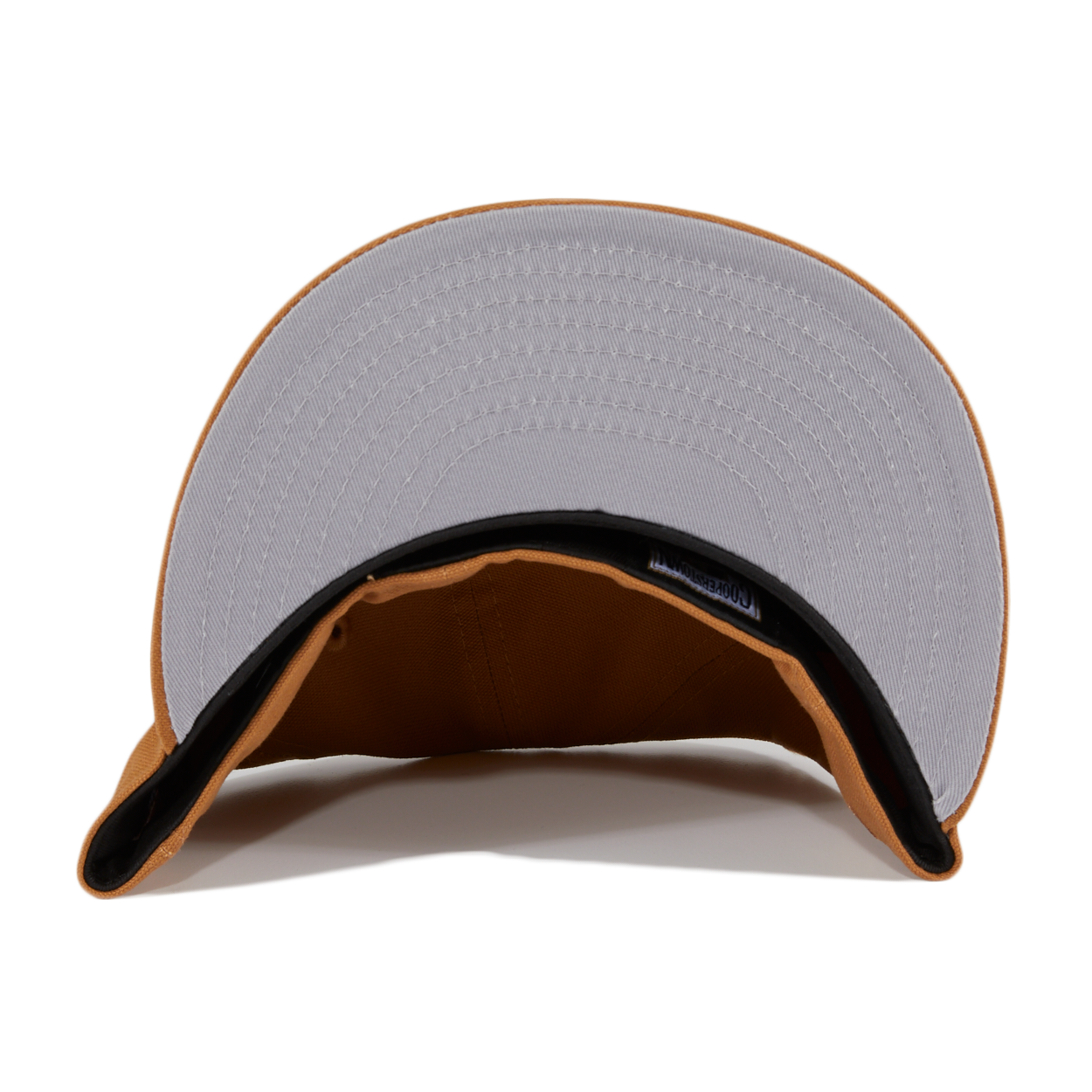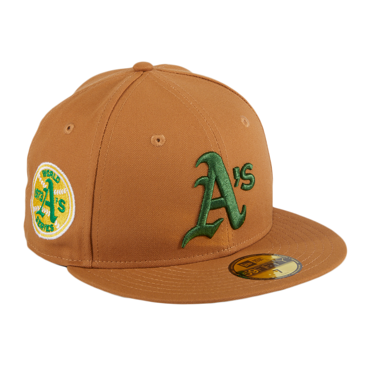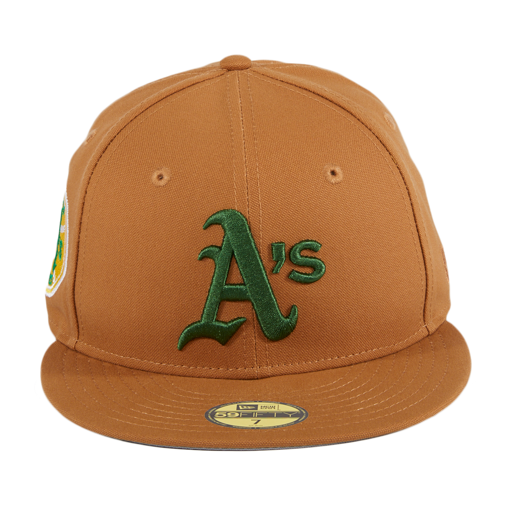 The Oakland Athletics Cowboy Pack fitted hat is a Hat Club Exclusive drop. The fitted hat features a light western brown six panel structured high crown, embroidered eyelets and fabric squatchee button. The flat bill of the fitted cap is also light brown with a grey bottom undervisor and black sweatband. The front panel features the Oakland A's logo embroidered in a dark rich green thread. The right panel features a World Series side patch. The back of the crown includes the official MLB Batterman logo embroidered in green, white and yellow thread.