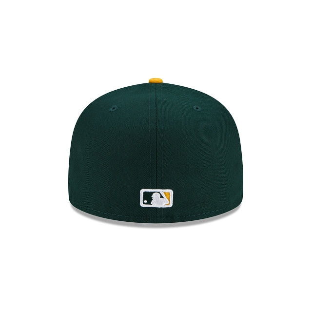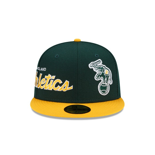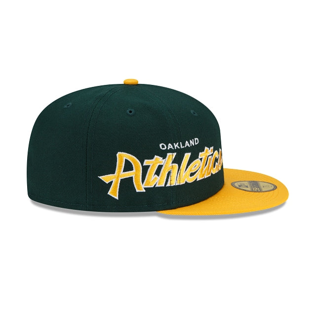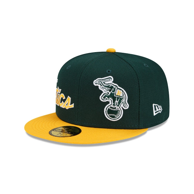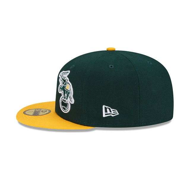 The Oakland Athletics Double Logo 59FIFTY Fitted Cap features a two tone team fabrication with an embroidered Athletics logo at the front left-wear panel, complimented by a team script at the right-wear side and a matching MLB Batterman logo at the rear.